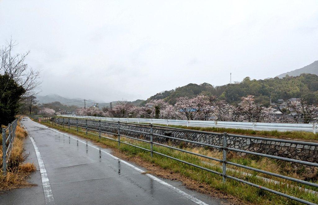 川沿いの桜並木。雲の切れ目から日差しが差し込むと暖かい。大三島藤公園 公園・植物園