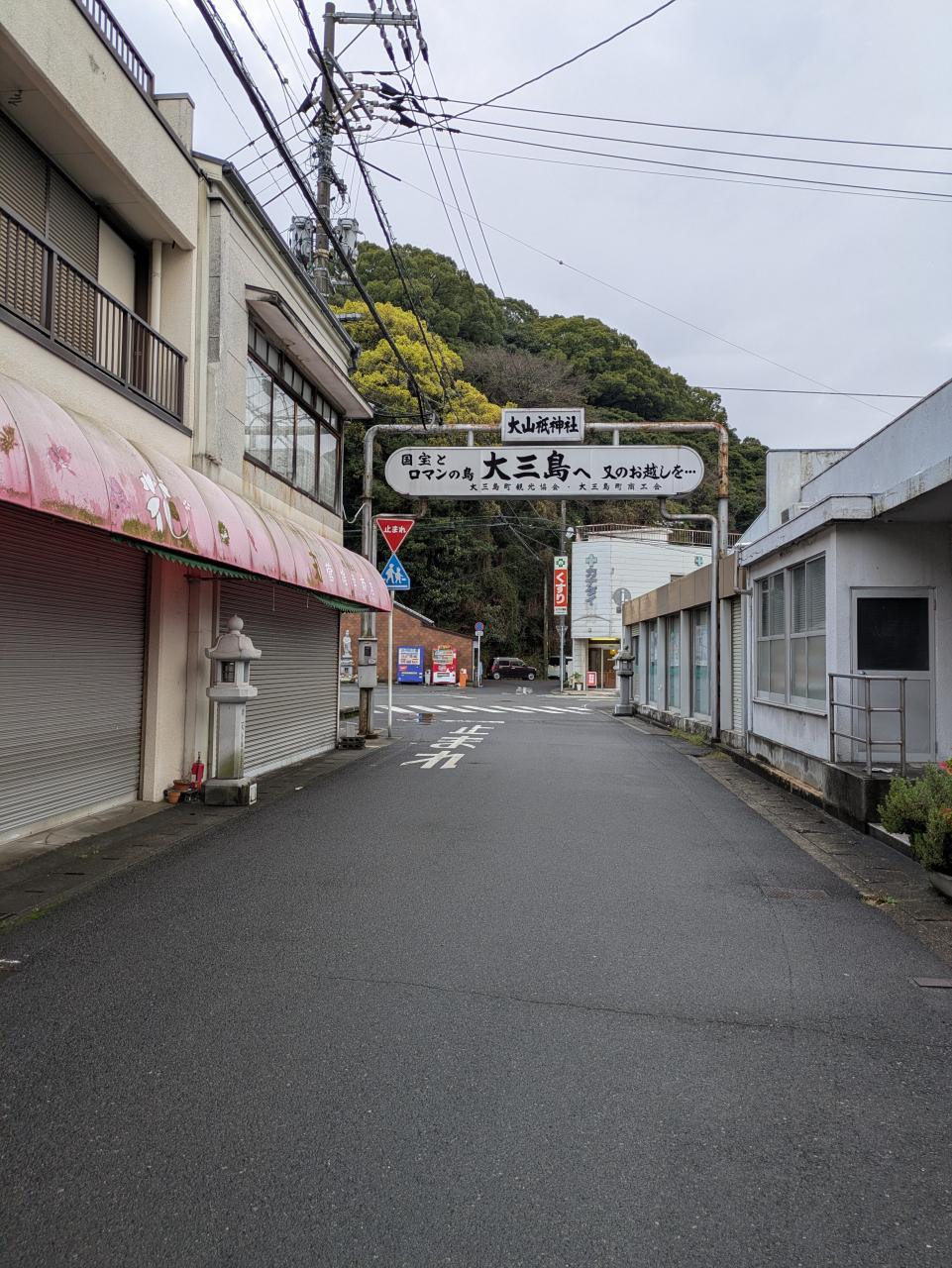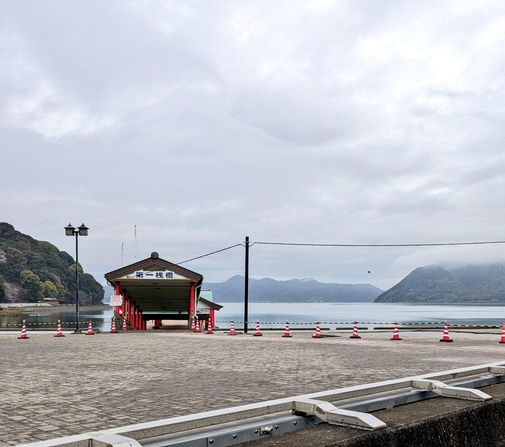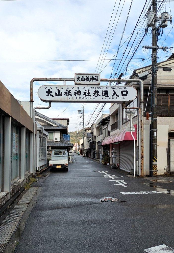 桟橋の手前に大山祇神社一の鳥居が立っている。