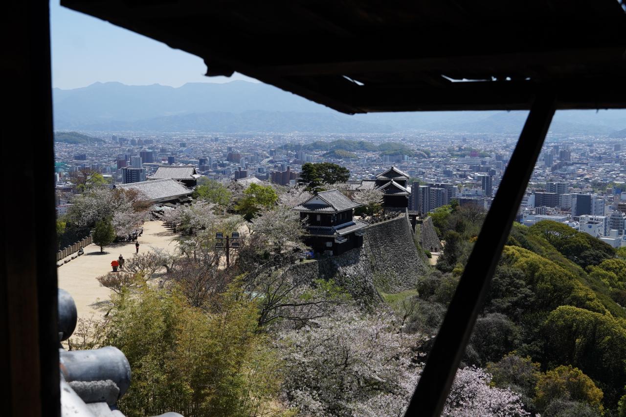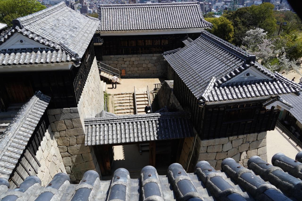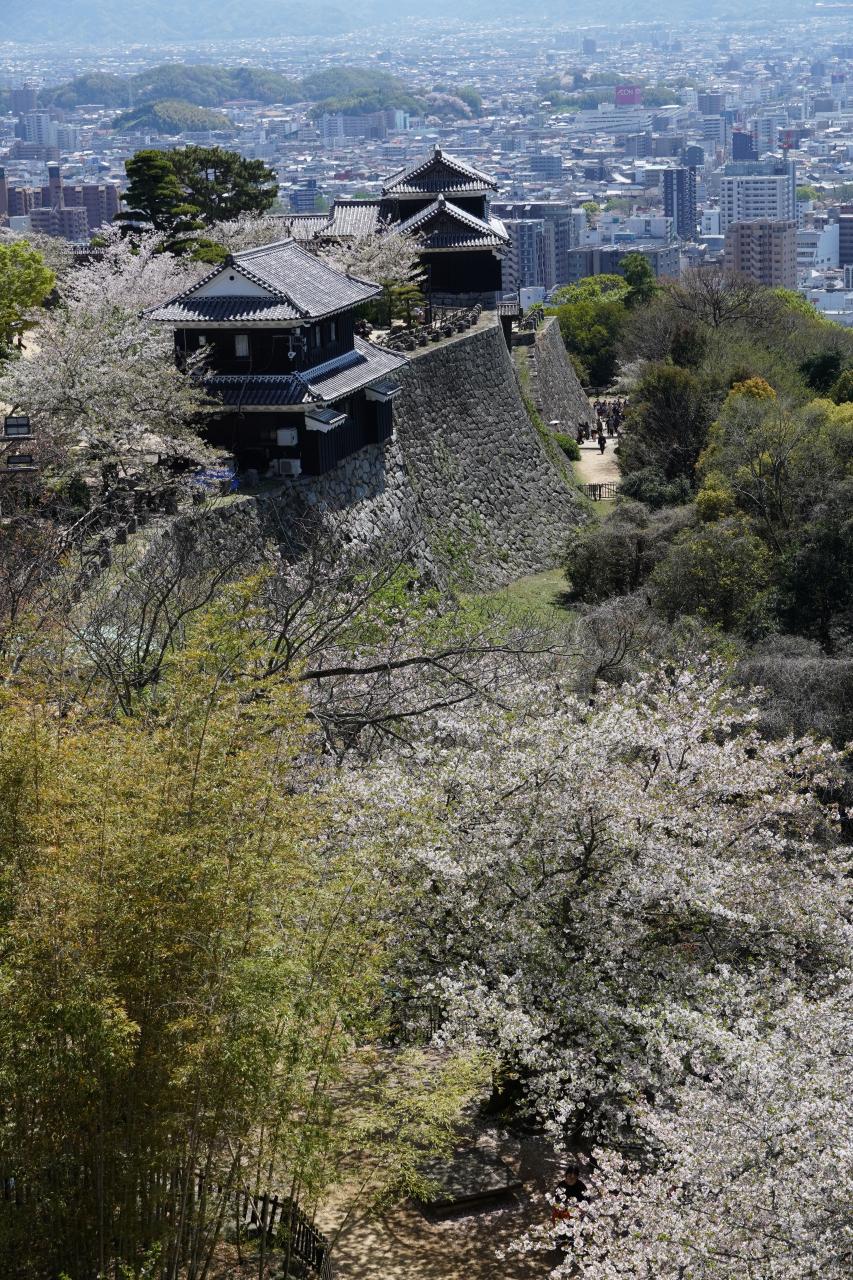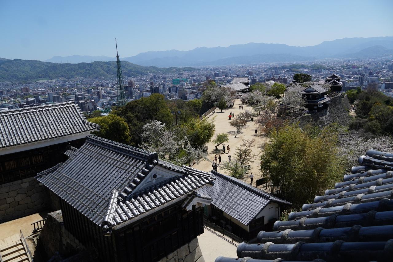 松山城は現存12天守最後の1城です。登城するにはロープウェイやリフトがあり、桜も残っており、沢山のお客さんでとても賑わっていました。