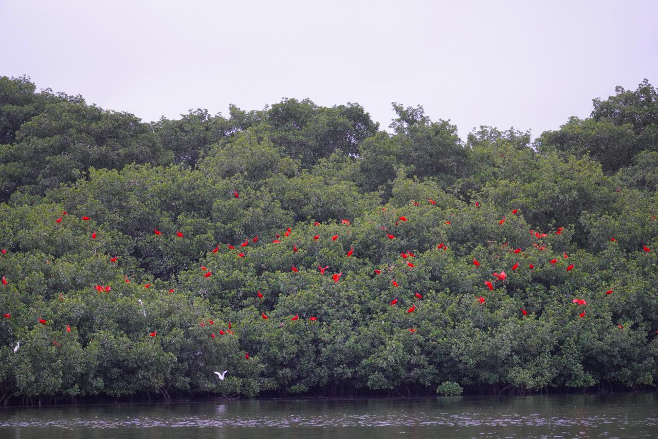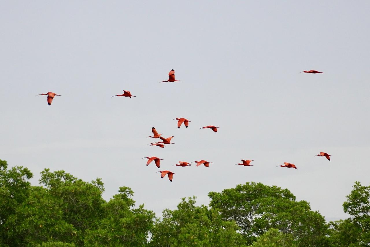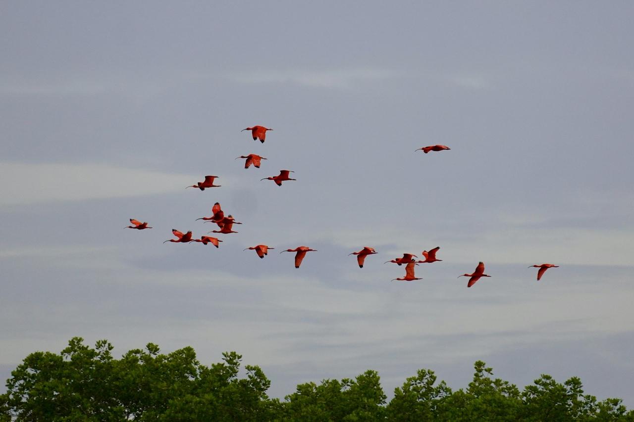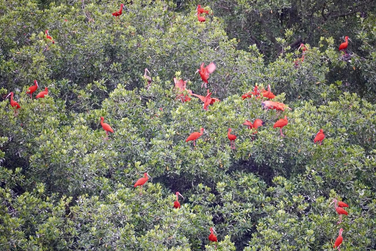 ここには真っ赤な鳥、スカーレットアイビスの寝ぐらがあり、観察をすることができます。日本ではショウジョウトキと呼ばれ、動物園などでみられるところもあります。