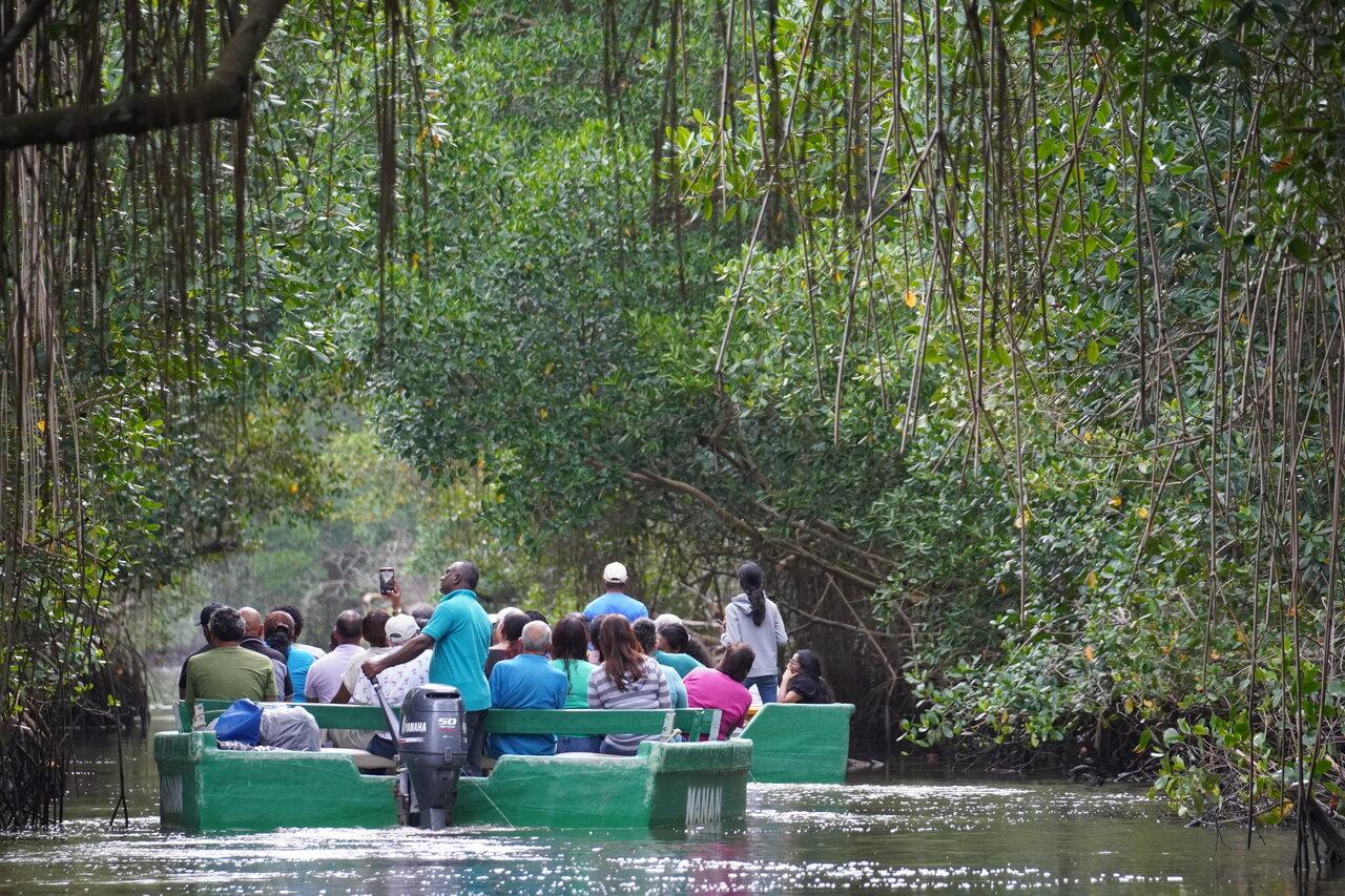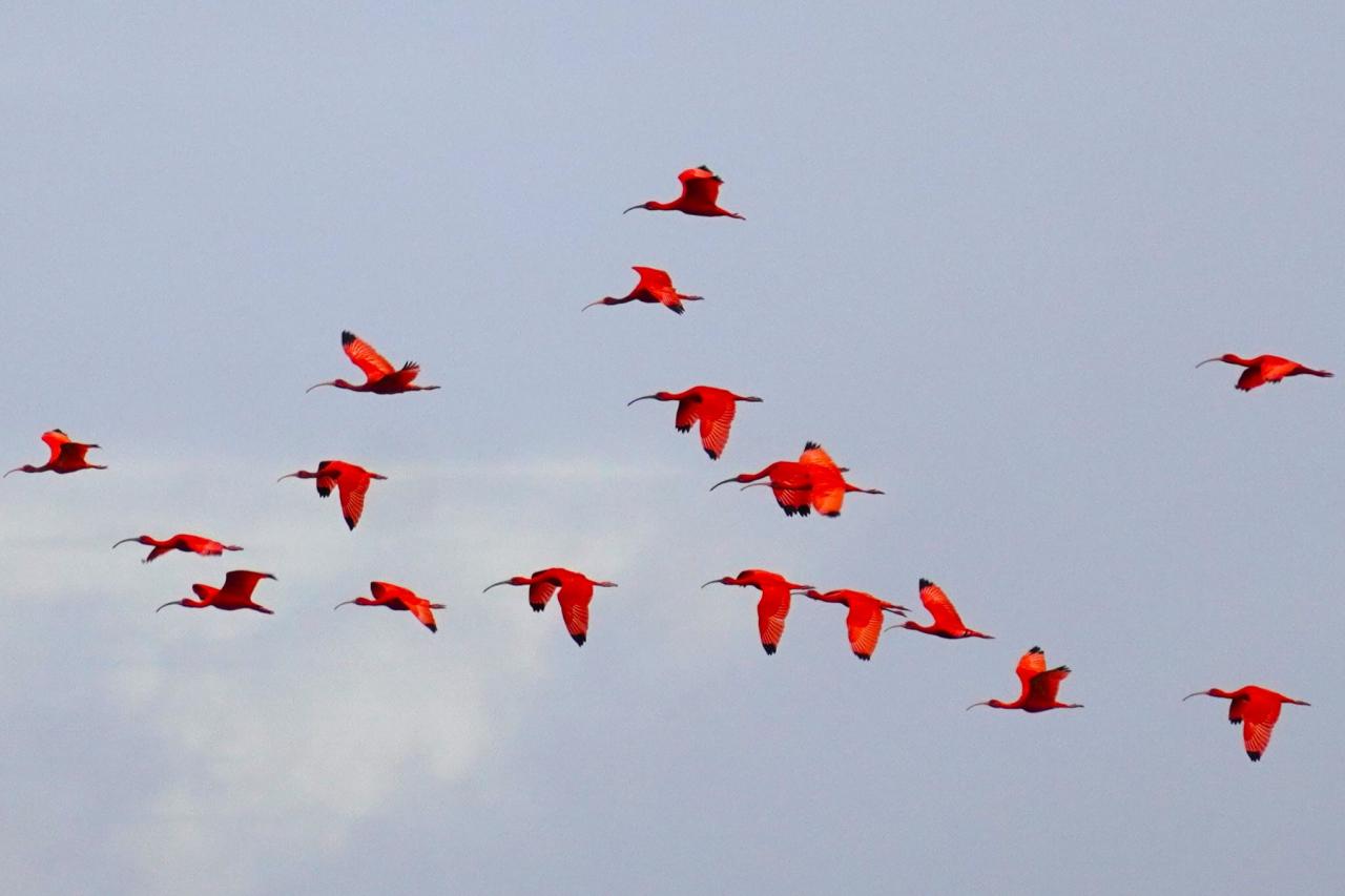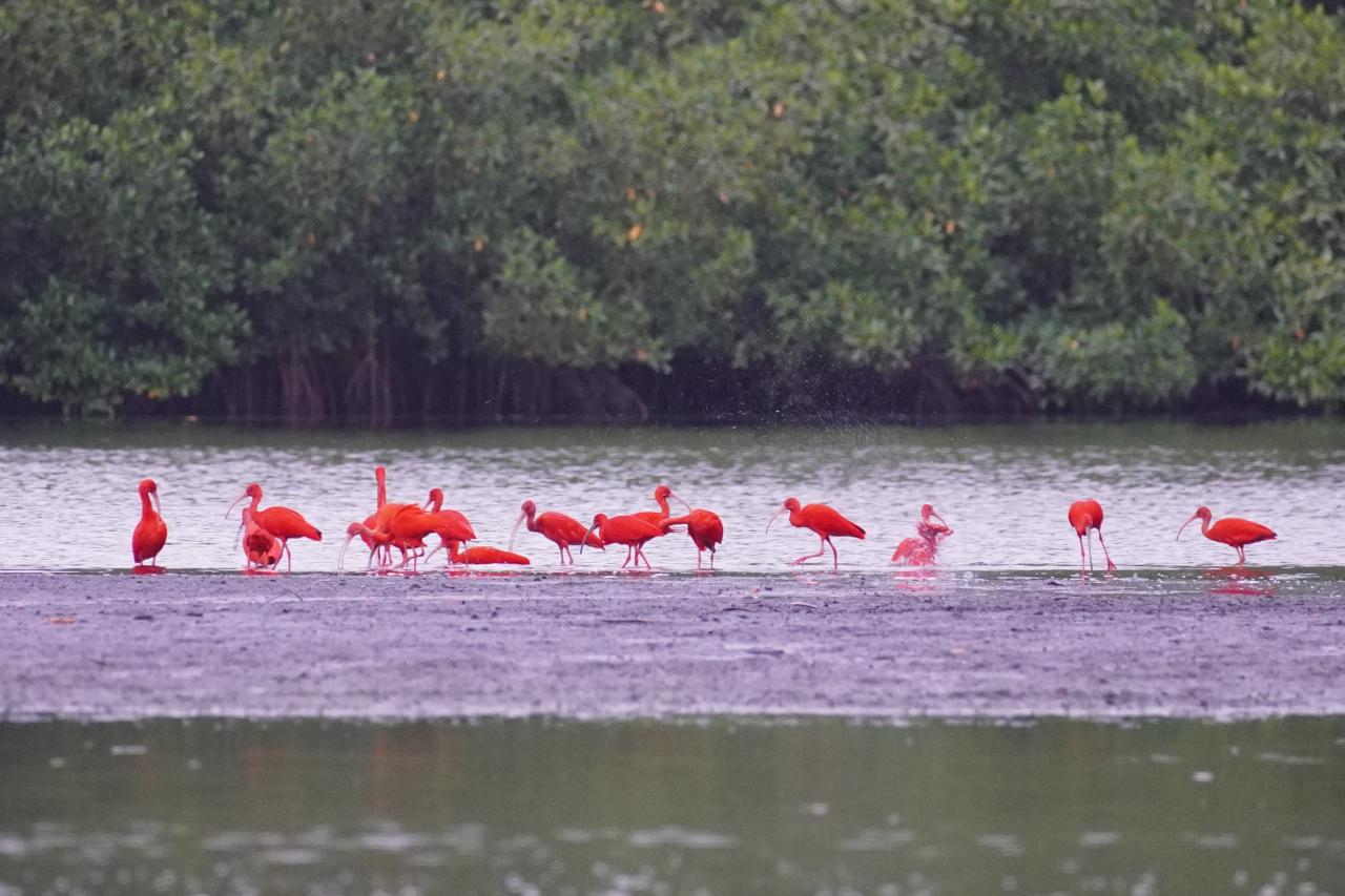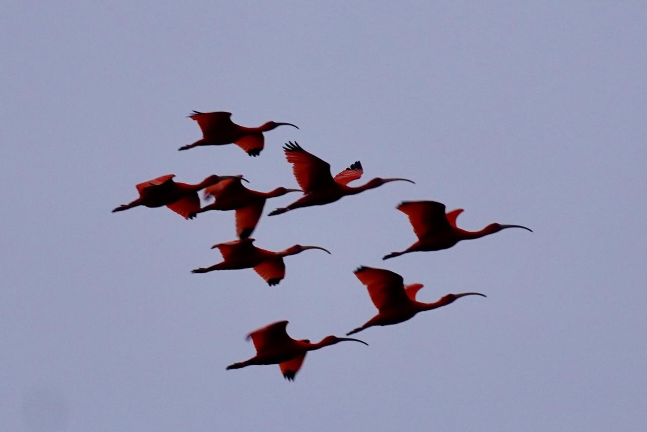 ここには真っ赤な鳥、スカーレットアイビスの寝ぐらがあり、観察をすることができます。日本ではショウジョウトキと呼ばれ、動物園などでみられるところもあります。
