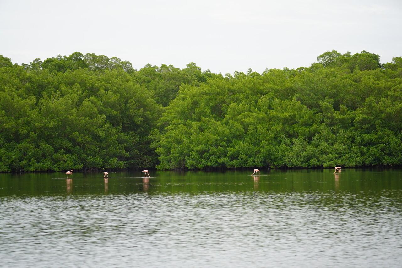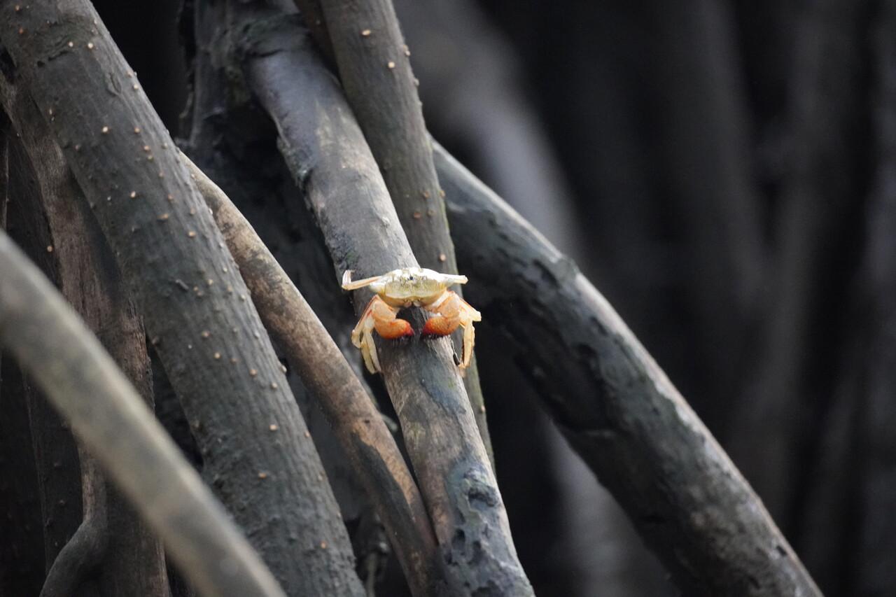 マングローブに小さいカニがいっぱいいます。このカニを食べることによって、スカーレットアイビスが鮮やかな赤い羽根になっていくそうです。