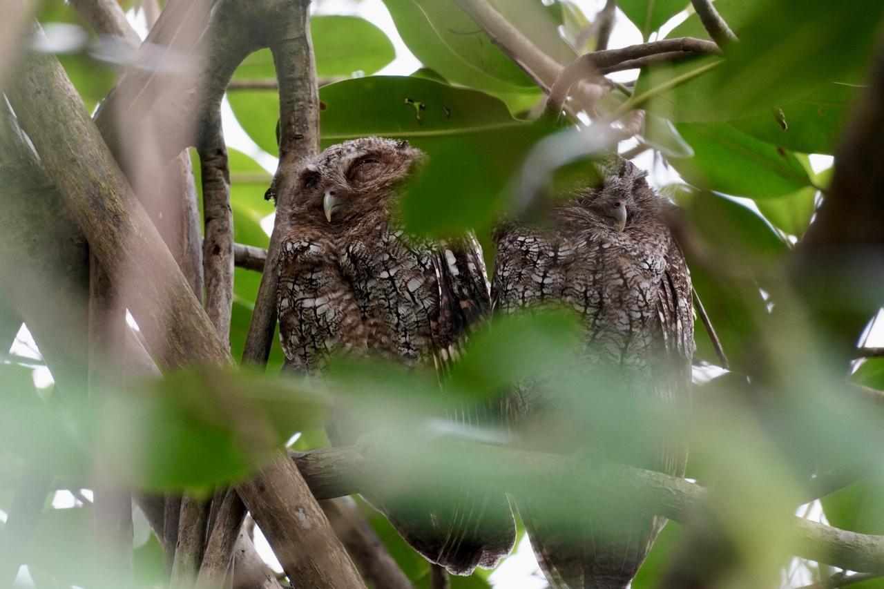 スピックスコノハズクTropical screech owl 2羽並んで寝ていました。