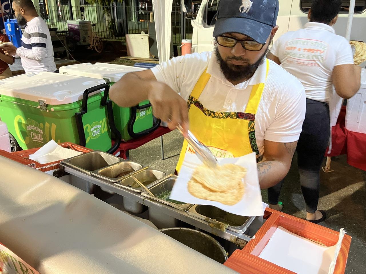 これはトリニダードの名物だそうです。ダブルスという名前です。小麦粉の生地を焼いたロティにレンズ豆のカレーを乗せます。