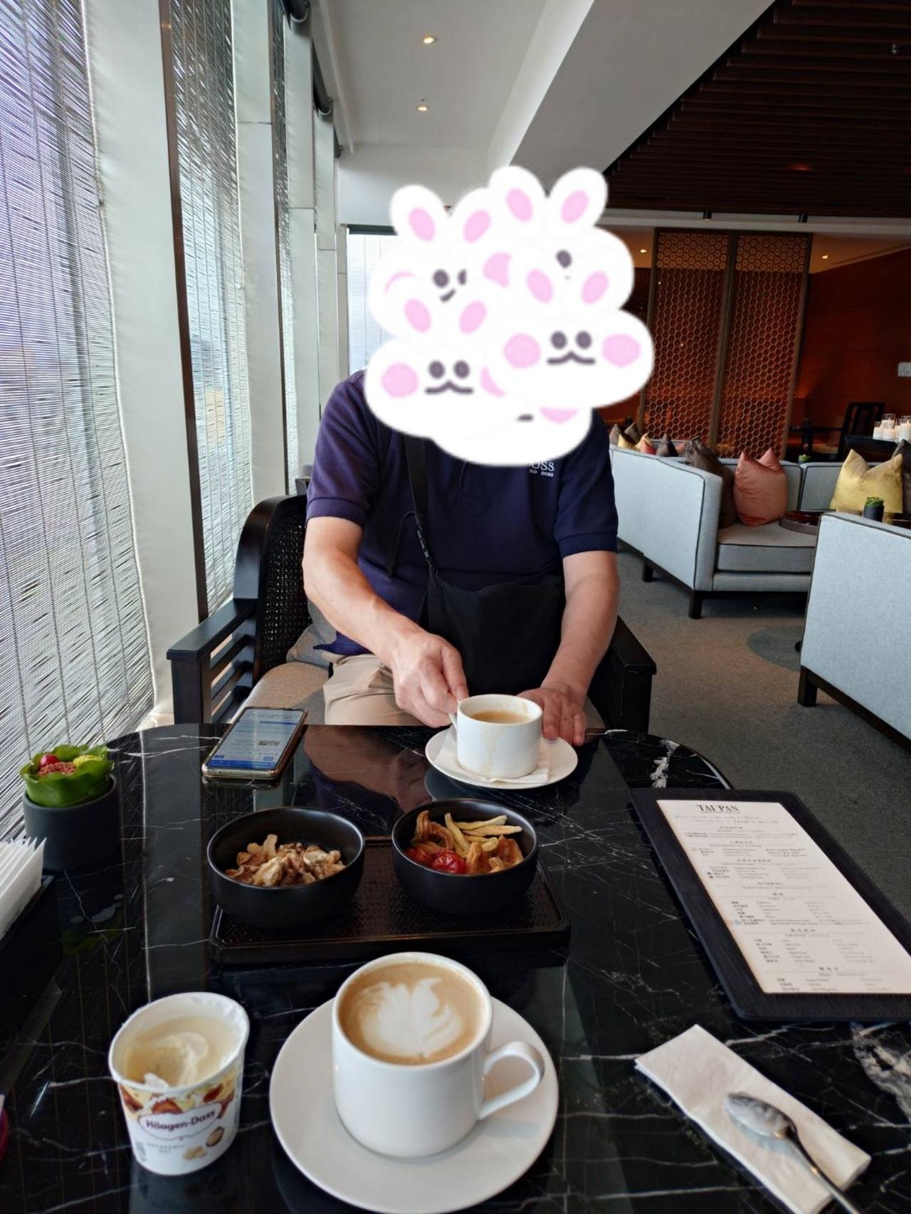 アフタヌーンティータイムですが、ケーキは断り、スナックとハーゲンダッツ。