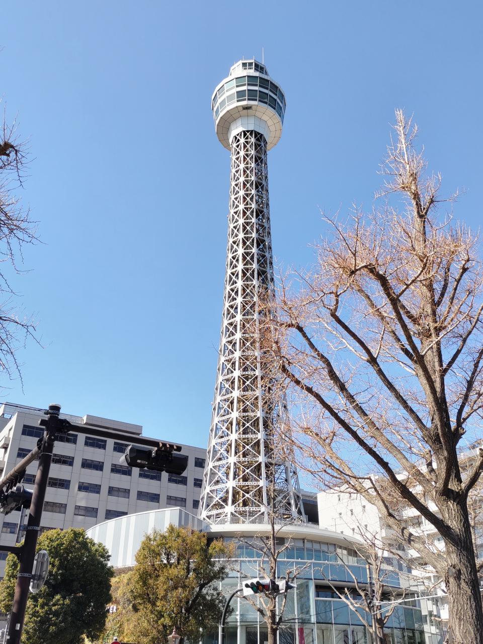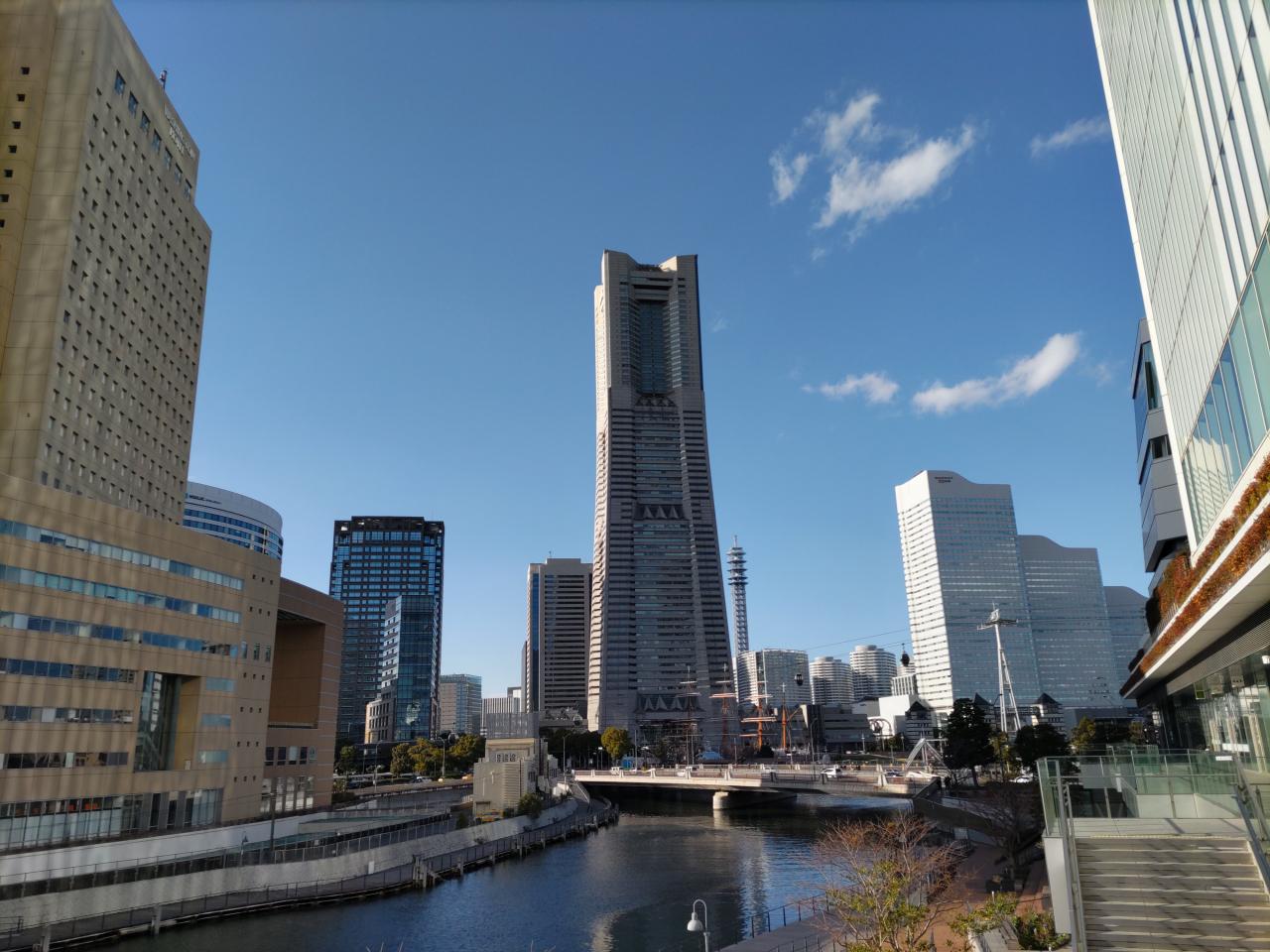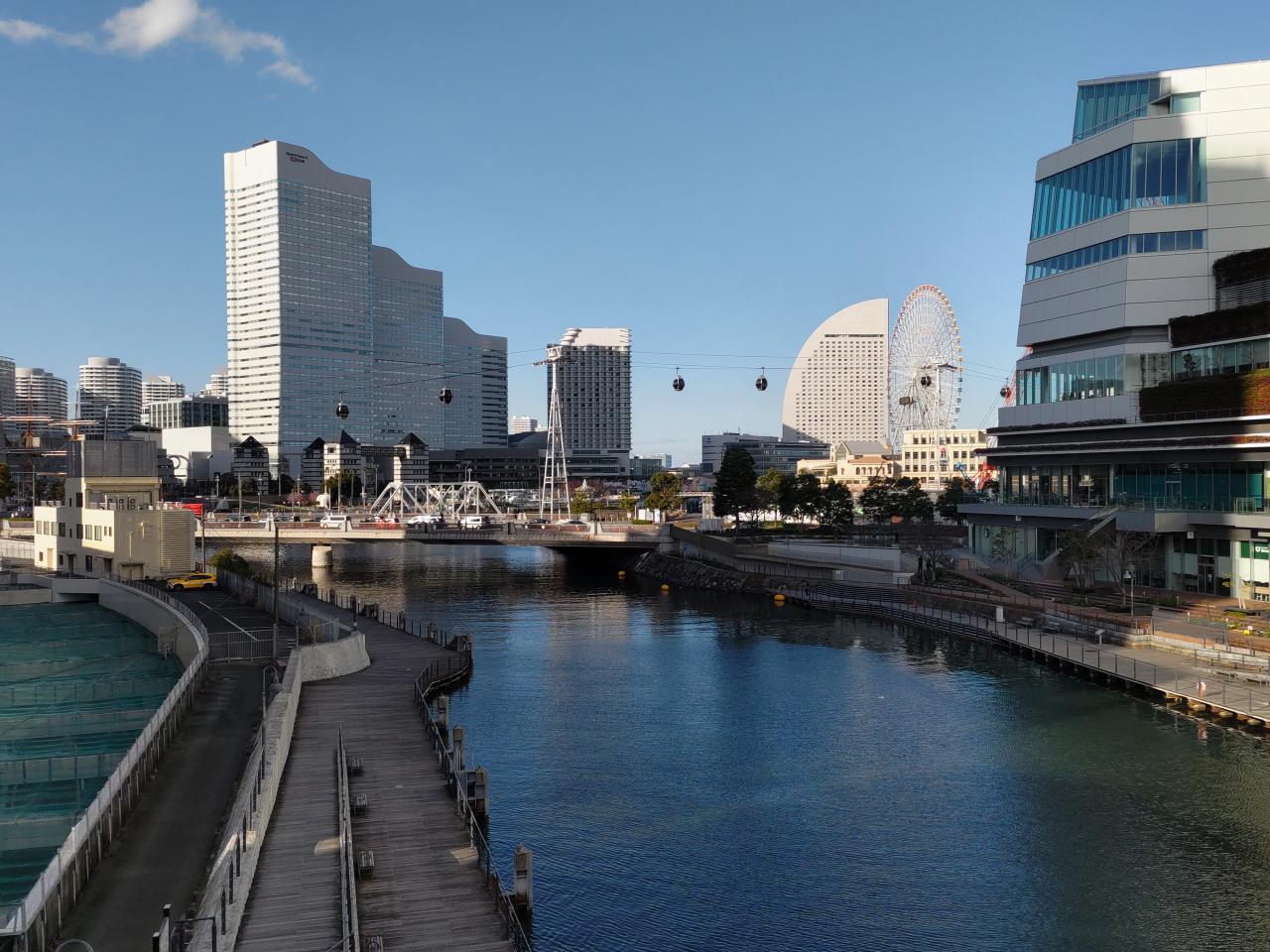 左を見ると、横浜ランドマークタワーなどの高層ビルが青空に映えてとても綺麗だ。手前には横浜エアーキャビンも動いている。