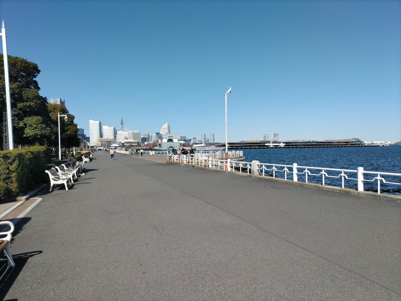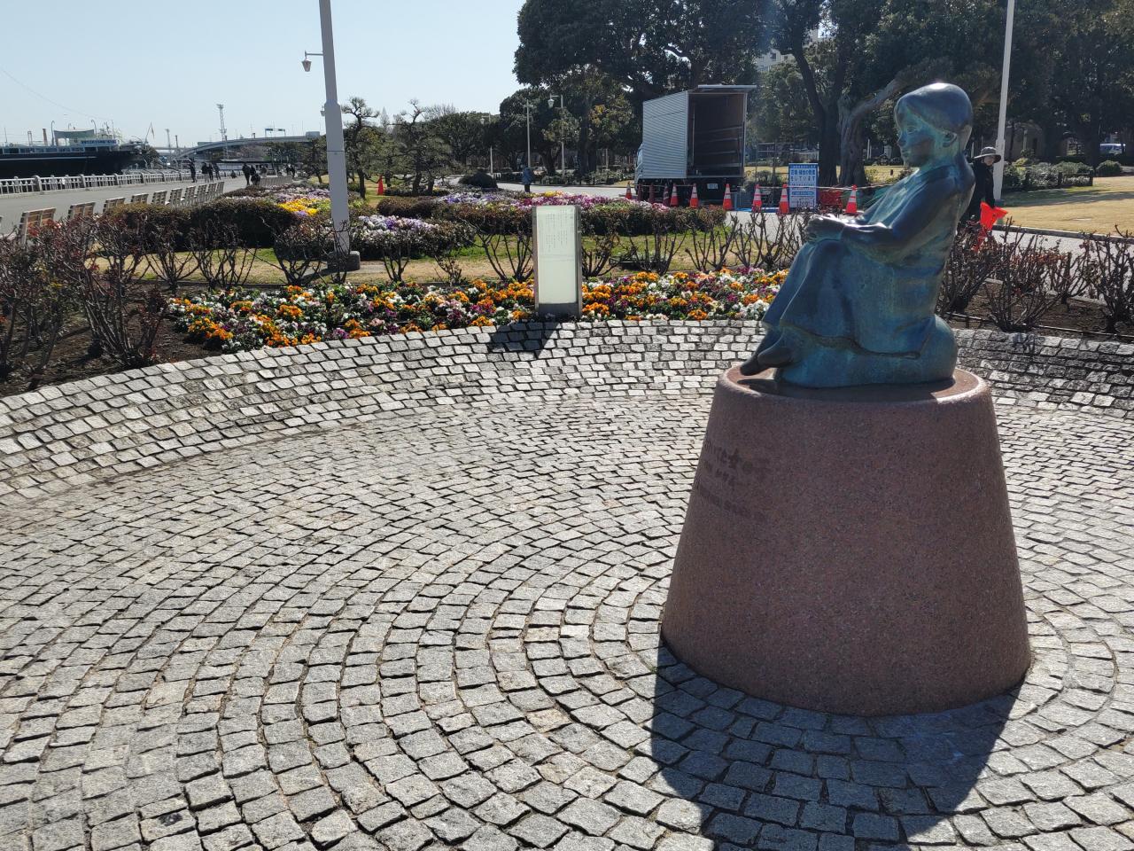 山下公園を西に歩いた。好天で春のような陽気であったため、ベンチに座ってのんびりする人や、スケッチを描いている人に沢山出会った。氷川丸、「赤い靴の女の子」像の前を通って西に歩いた。風がとても心地よい。