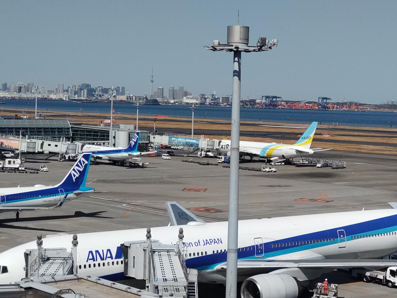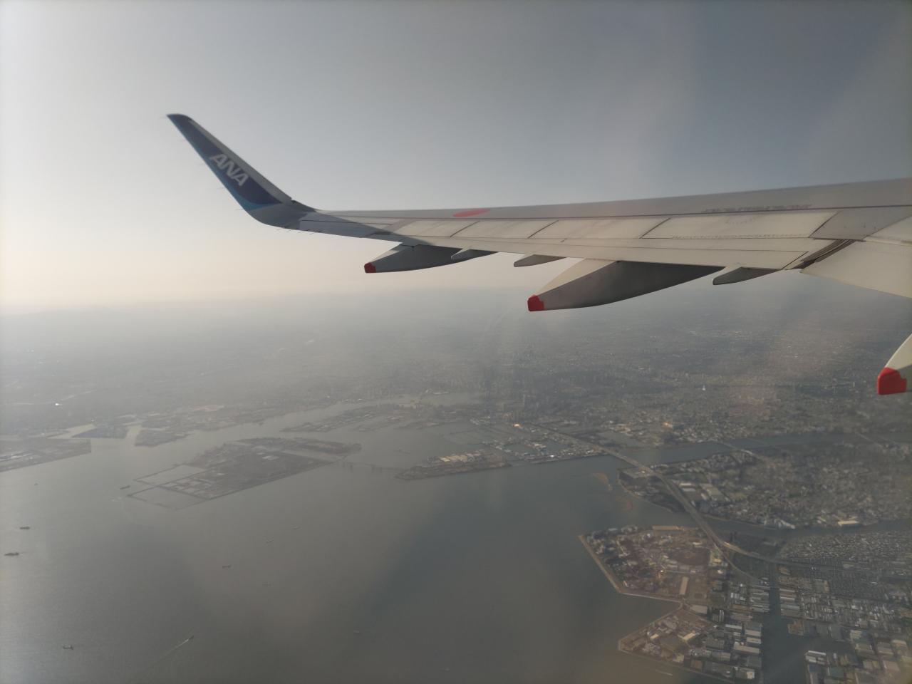 全日空機は羽田空港を離陸。A席から東京湾がよく見える。
