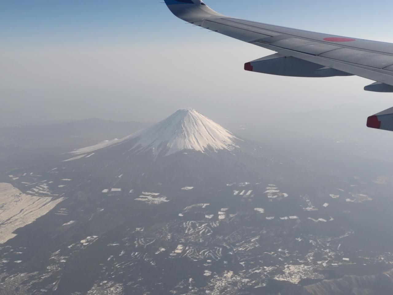 出発が少し遅れたが、離陸後10数分で窓の外、眼下に雪を被った富士山がはっきり見え、数分すると南アルプスの山々が眼下に広がっていた。機内アナウンスでは通常より低い位置を飛行しているとのこと、こんなに近くから富士山や北岳などの山々が見えたのは初めてで、とても綺麗だった。午後5時頃、全日空機は無事広島空港に着陸した。