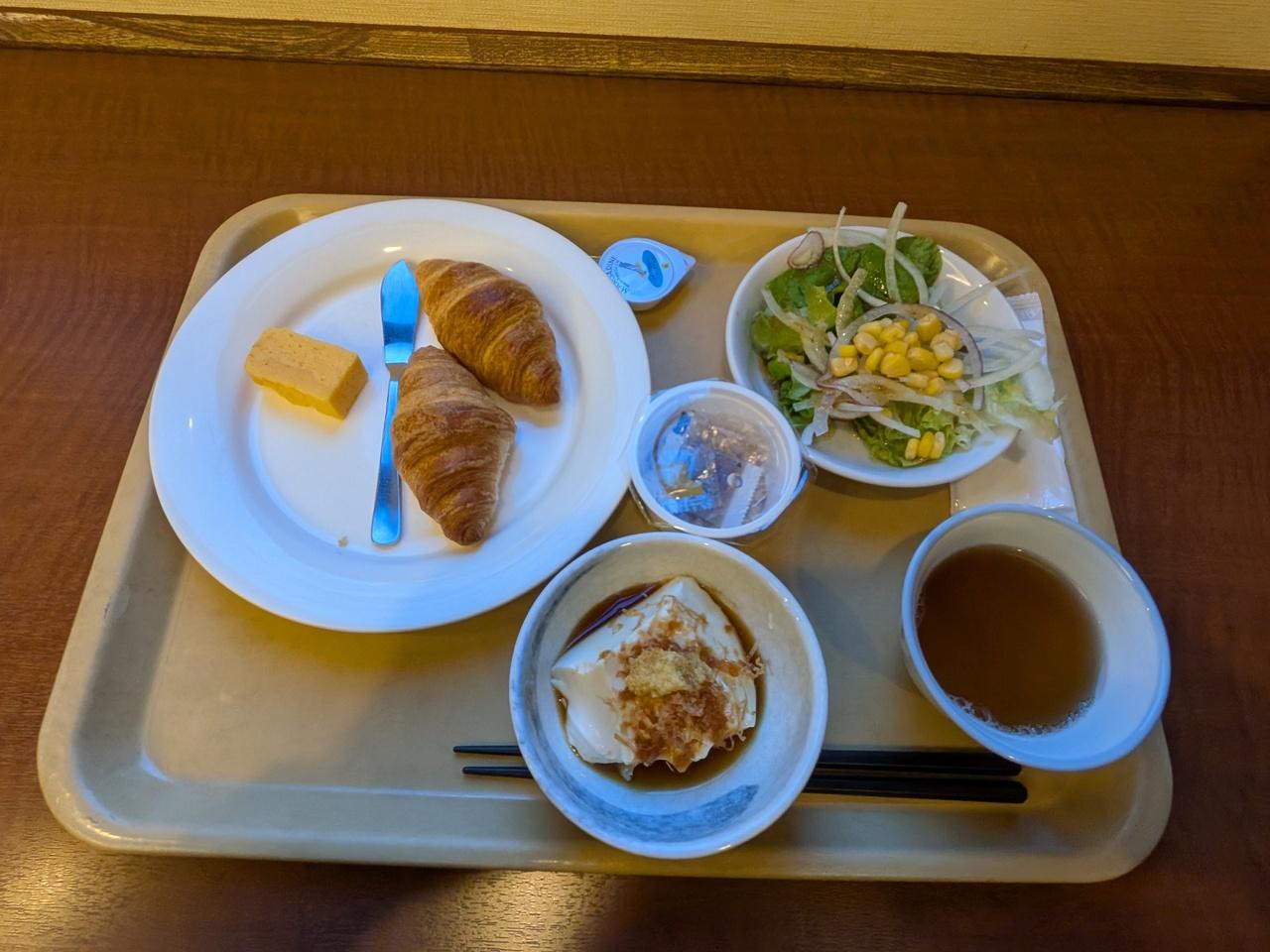 クロワッサン、湯豆腐、サラダ。