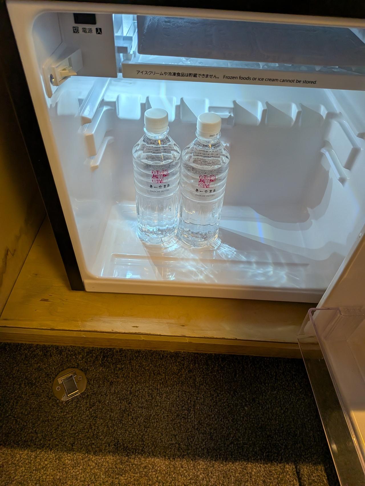 冷蔵庫の中にはペットボトルの水2本。