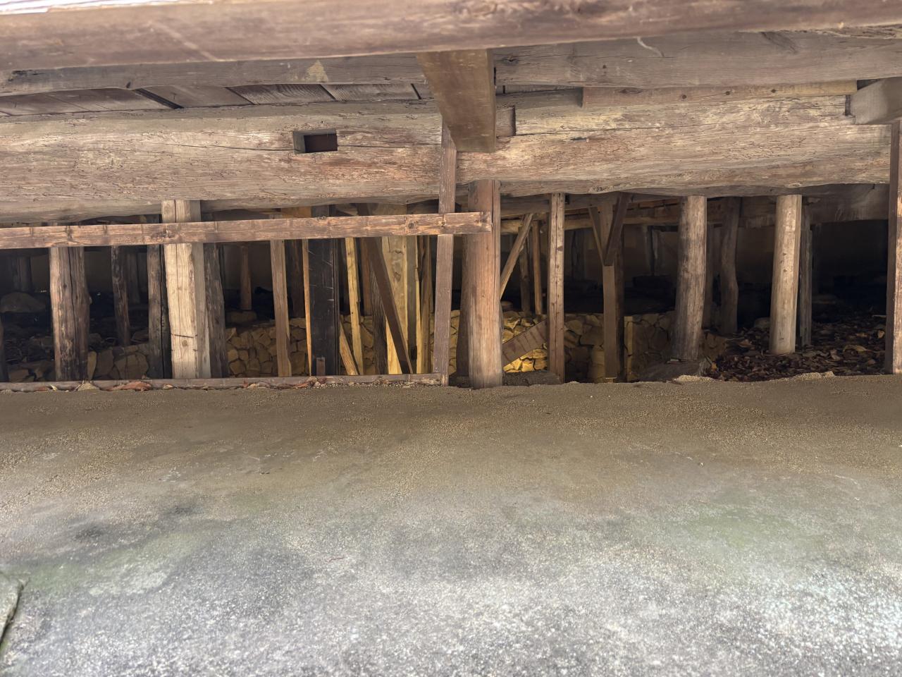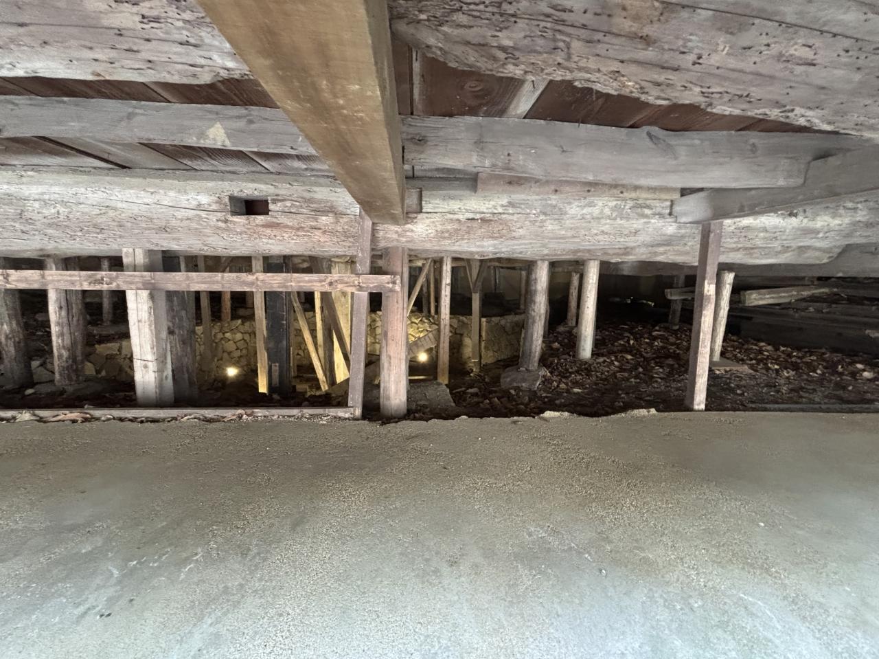 愛媛県の山奥にあった農家の道具蔵で、板張りの下は土蔵になっています。