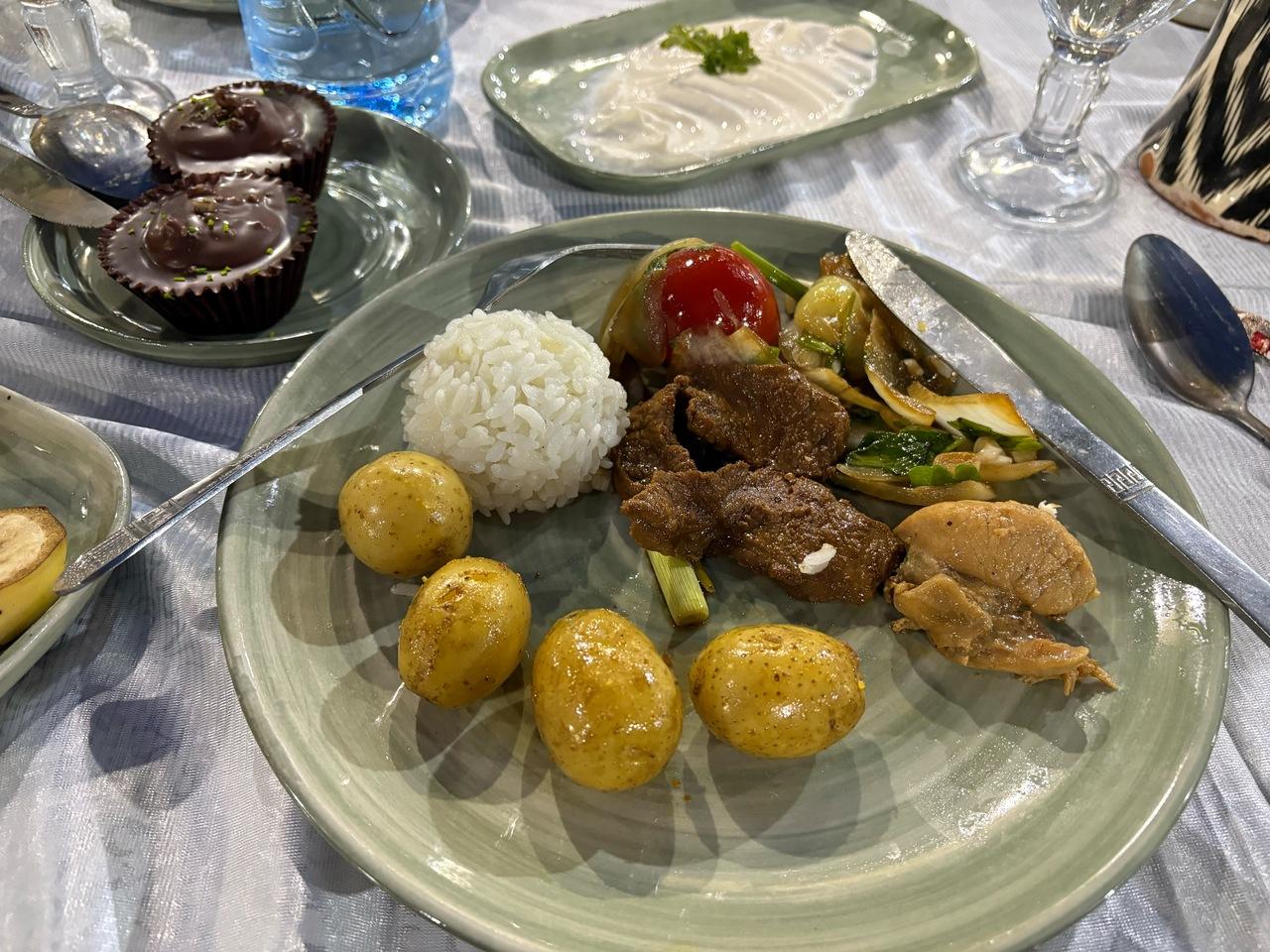 メインは鳥と牛のロースト 左奥がチョコレートケーキ 奥の白いのはスメタナ?サワークリームの濃いみたいな