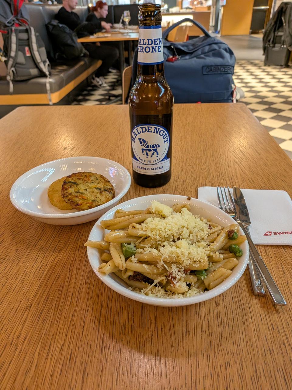 空港は激混みで座るベンチもなかったけど、会社土産などを買っていたら搭乗時間に。チューリッヒ経由なのでSwiss Airの子会社のフライトに乗ります。