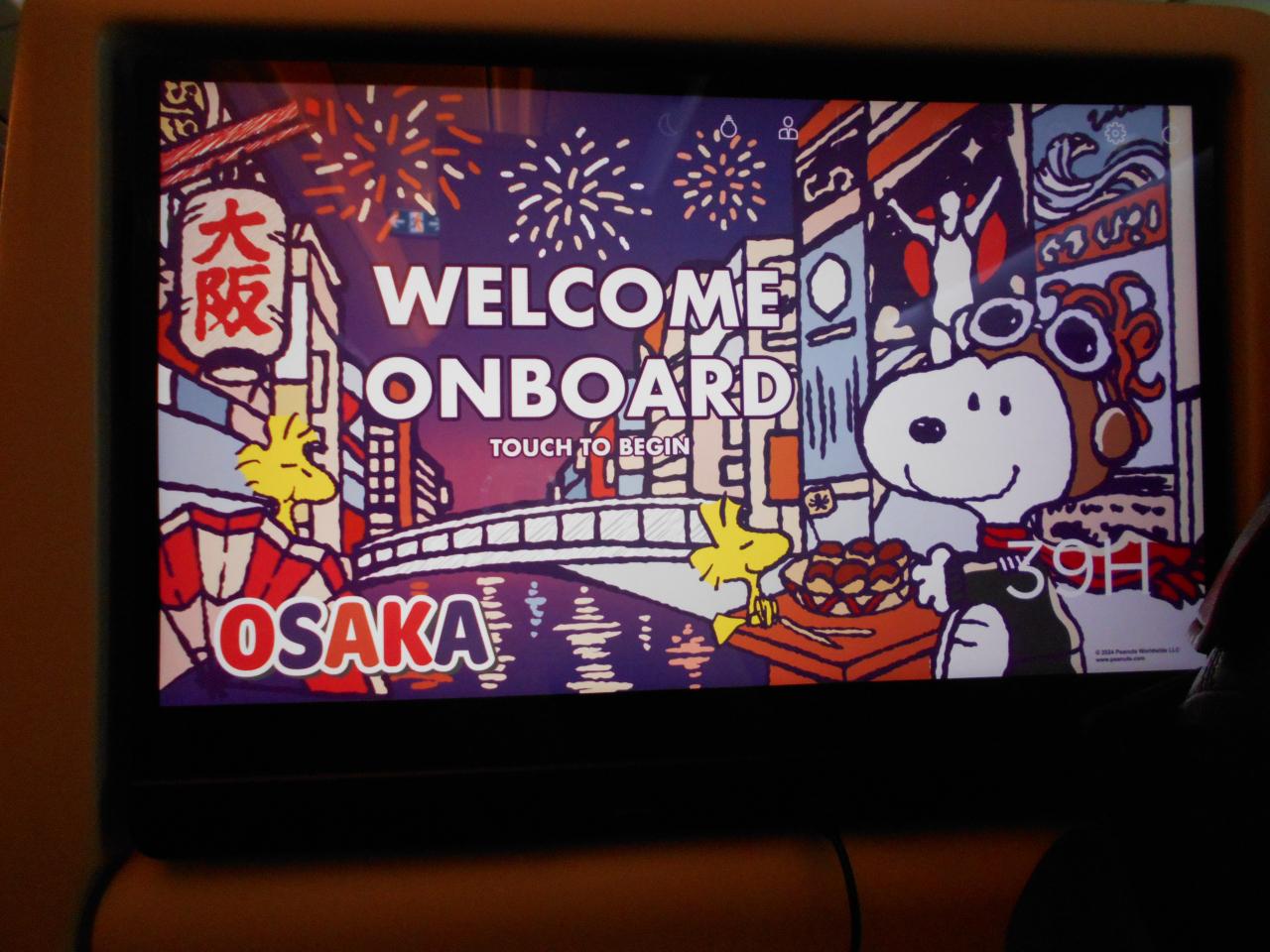個人用モニターの起動画面には、道頓堀観光を楽しんでいるスヌーピーとウッドストックが登場していました。 -