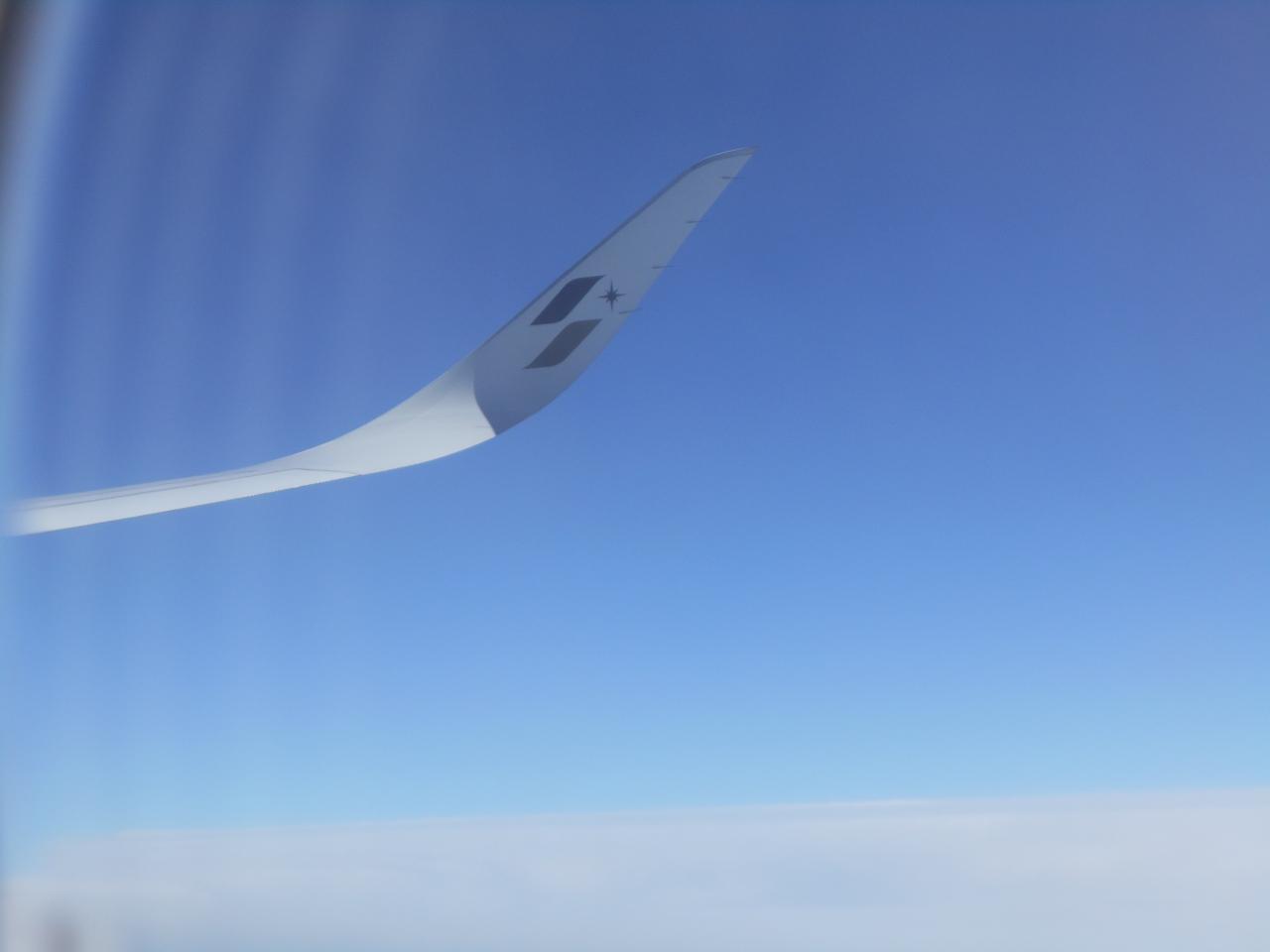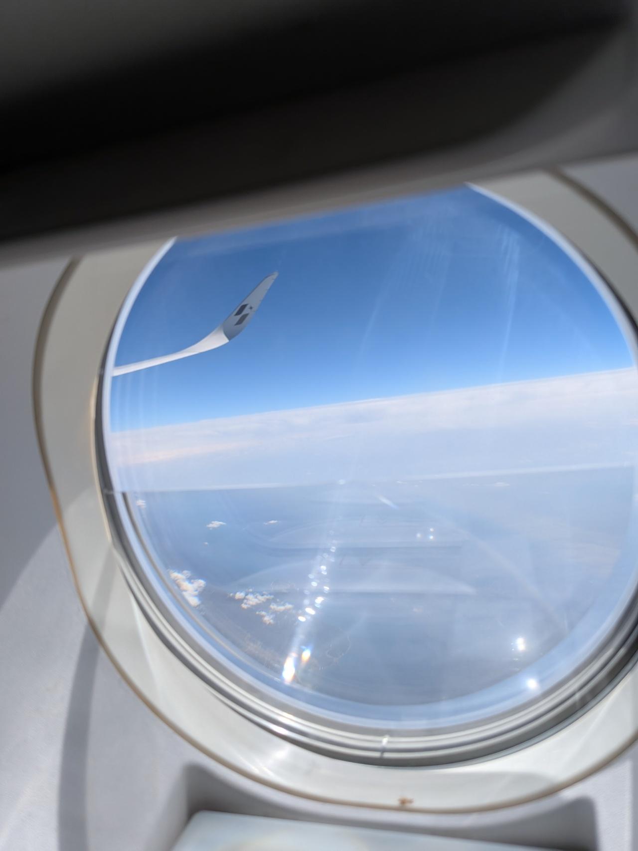 非常口の小窓から撮影したA350-900XWBのウイングレット。