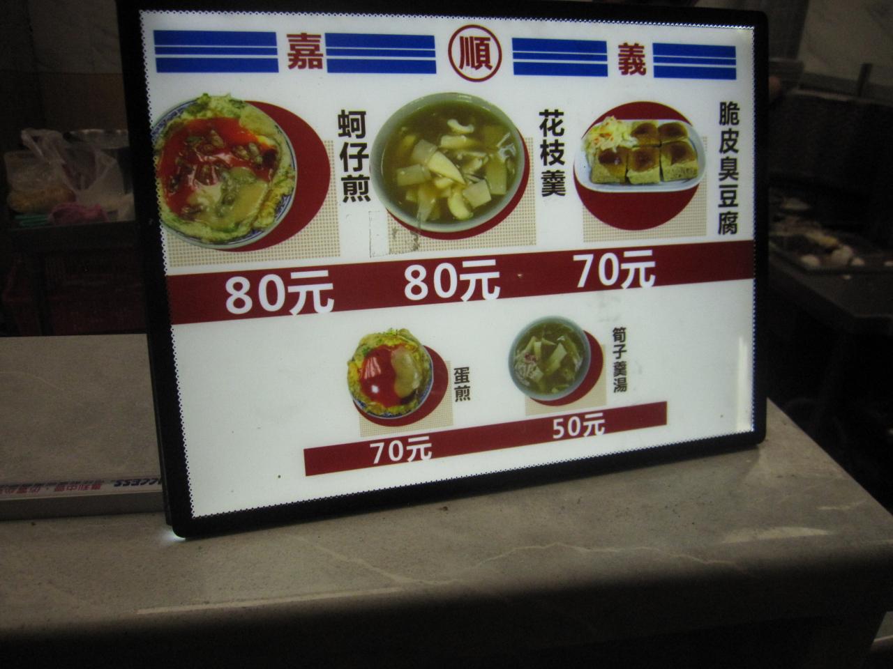 看板メニューは蚵仔煎(80元)・花枝羹(イカのスープ)(80元)、臭豆腐(70元)。
