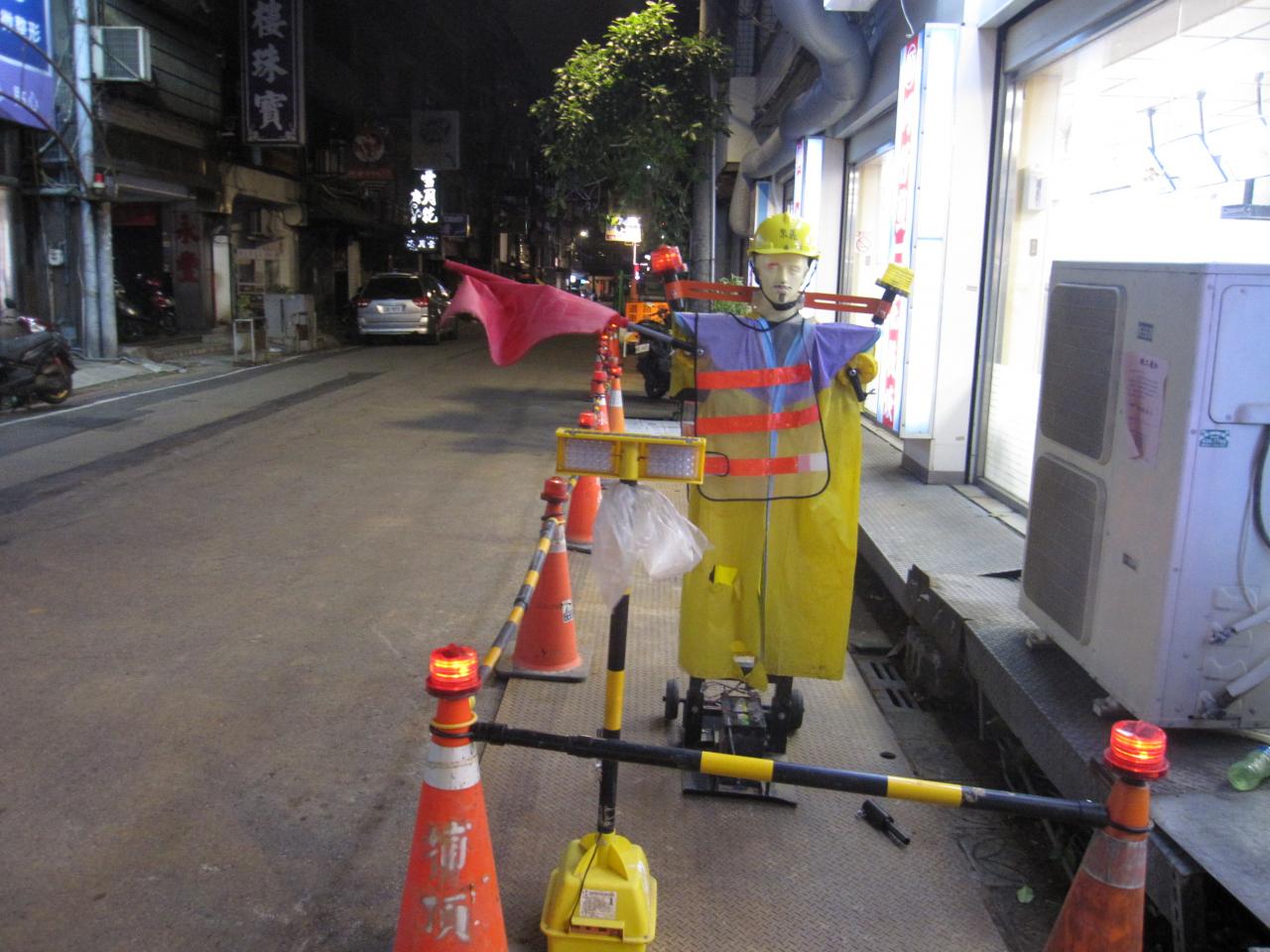 蚵仔煎屋さんの隣には、工事現場の旗振り人形が。