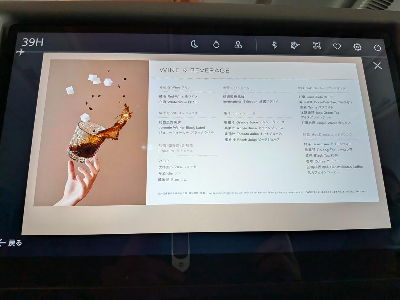 離陸前に、まずはドリンクサービスのメニューをチェックしました。 -