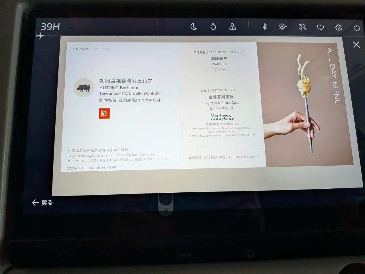 そしてこちらが機内食のメニュー。