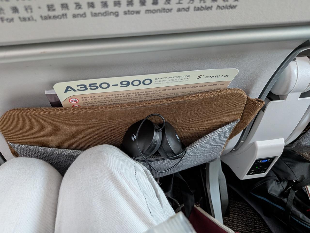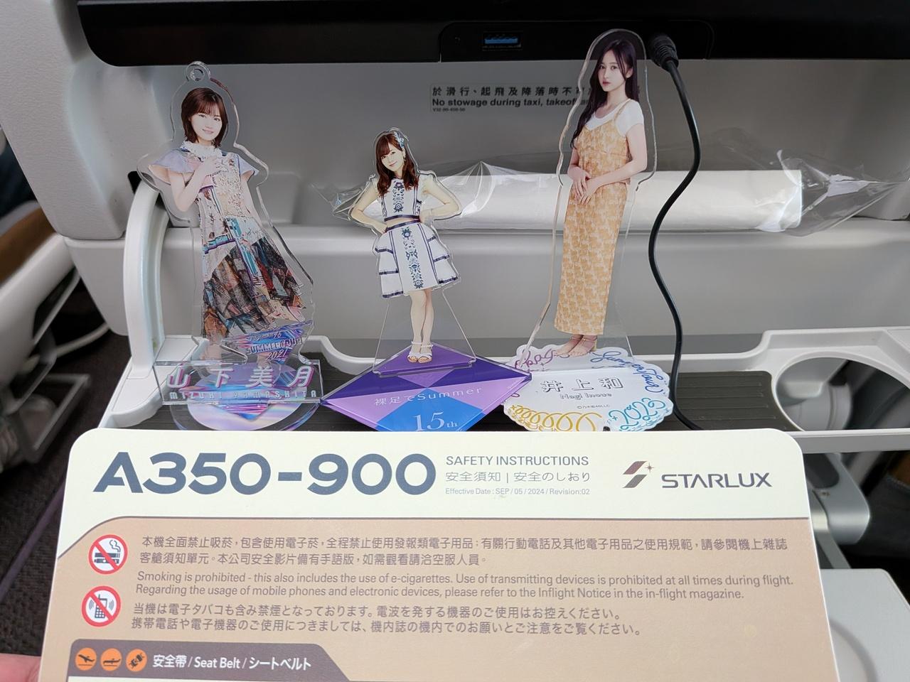 A330-900neoの座席もそうですが、座席の個人用モニター下に小物入れがあると、スマホや眼鏡、化粧品を置けるほか、推し活グッズの撮影にも使えるので助かります。