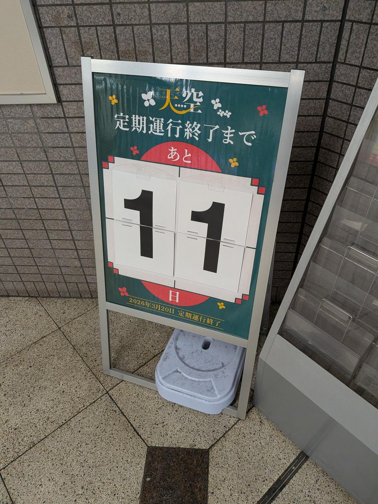 天下茶屋駅にあった、南海高野線の観光列車「天空」の定期運行終了(3月20日)を告げるカウントダウンボード。