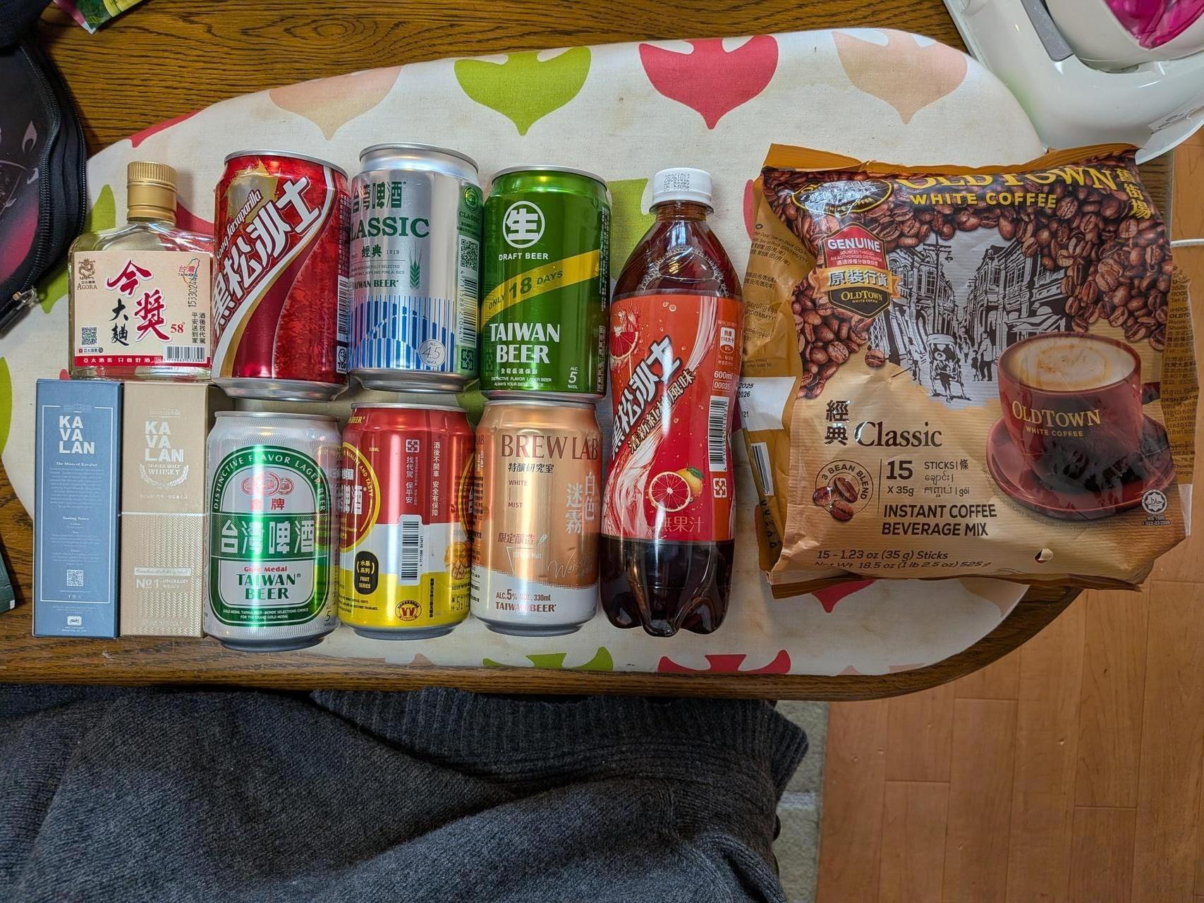 台湾啤酒を5缶買ったほか、「黒松沙士」のシトラス味、高粱酒、さらにはカバランウイスキーの小瓶やマレーシア「OLD TOWN」のホワイトコーヒーまで買うことができました。 -