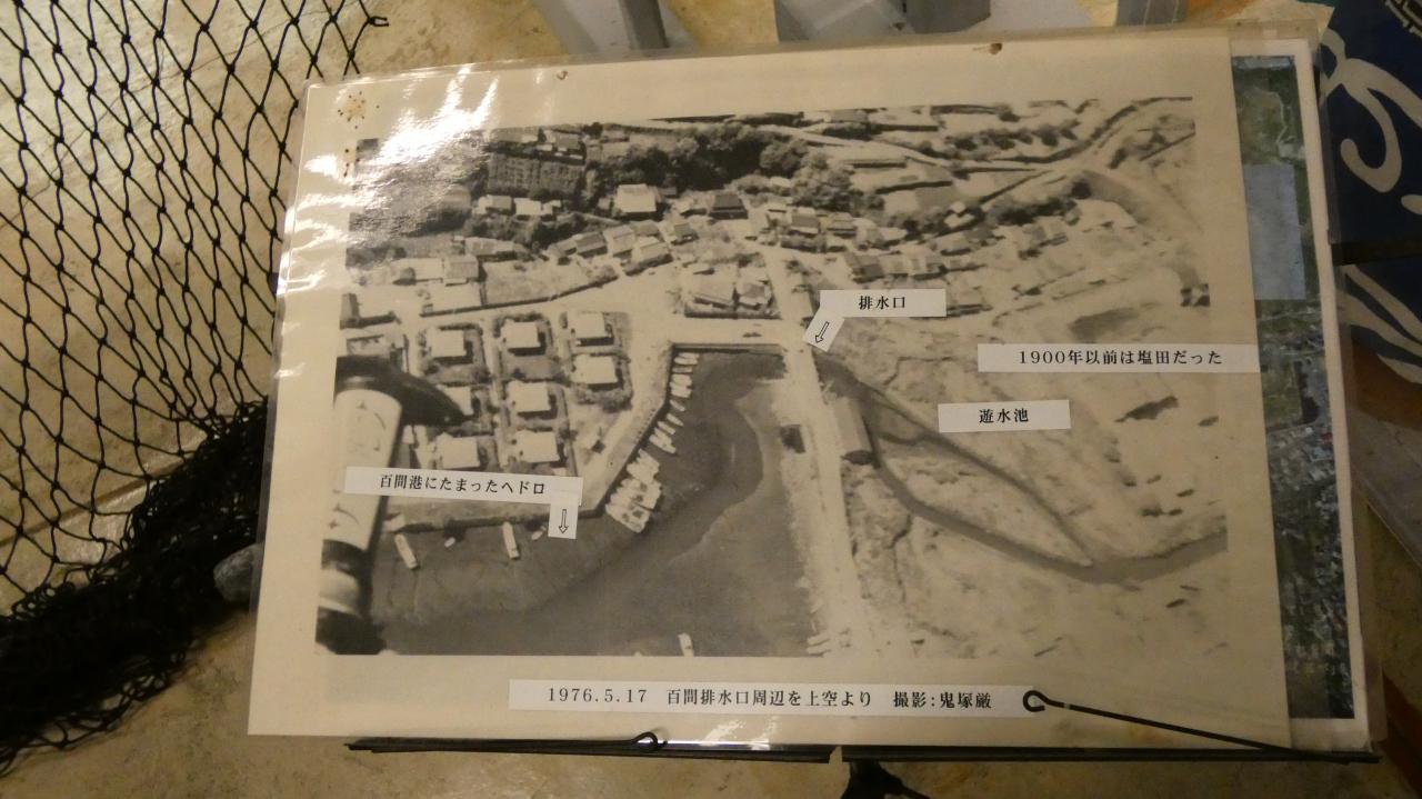 排水口の目の前は、百間漁港でして木造の漁船が係留されていました。