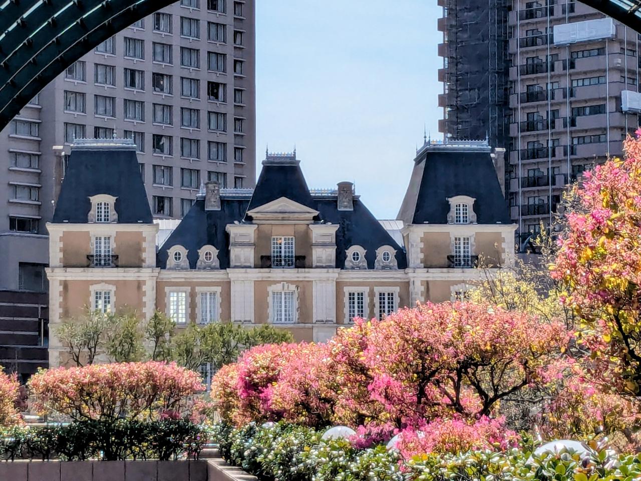 最後にもう一枚、紅色の花と恵比寿のシャトーをパシャリとして恵比寿駅に戻ります。