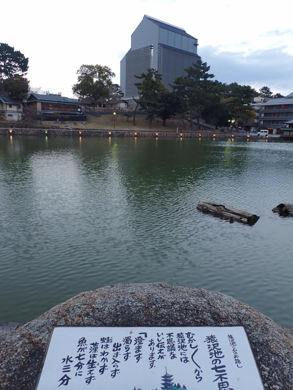 池の向こうに見える覆いは興福寺の五重塔がある場所。