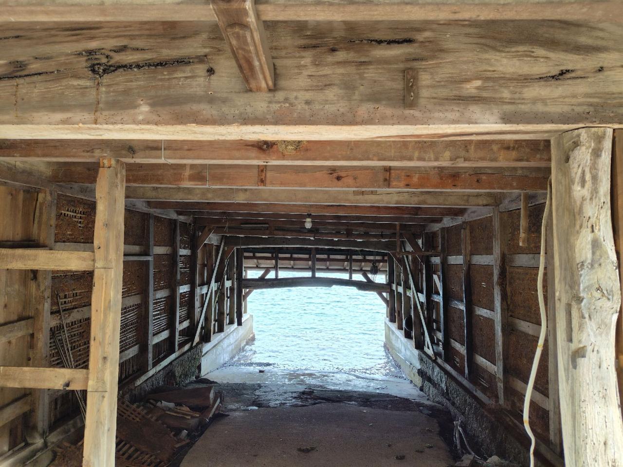 2隻の船がガレージに納まっている舟屋。