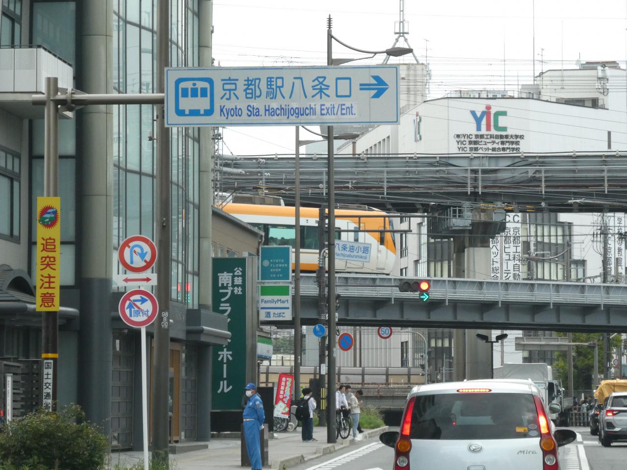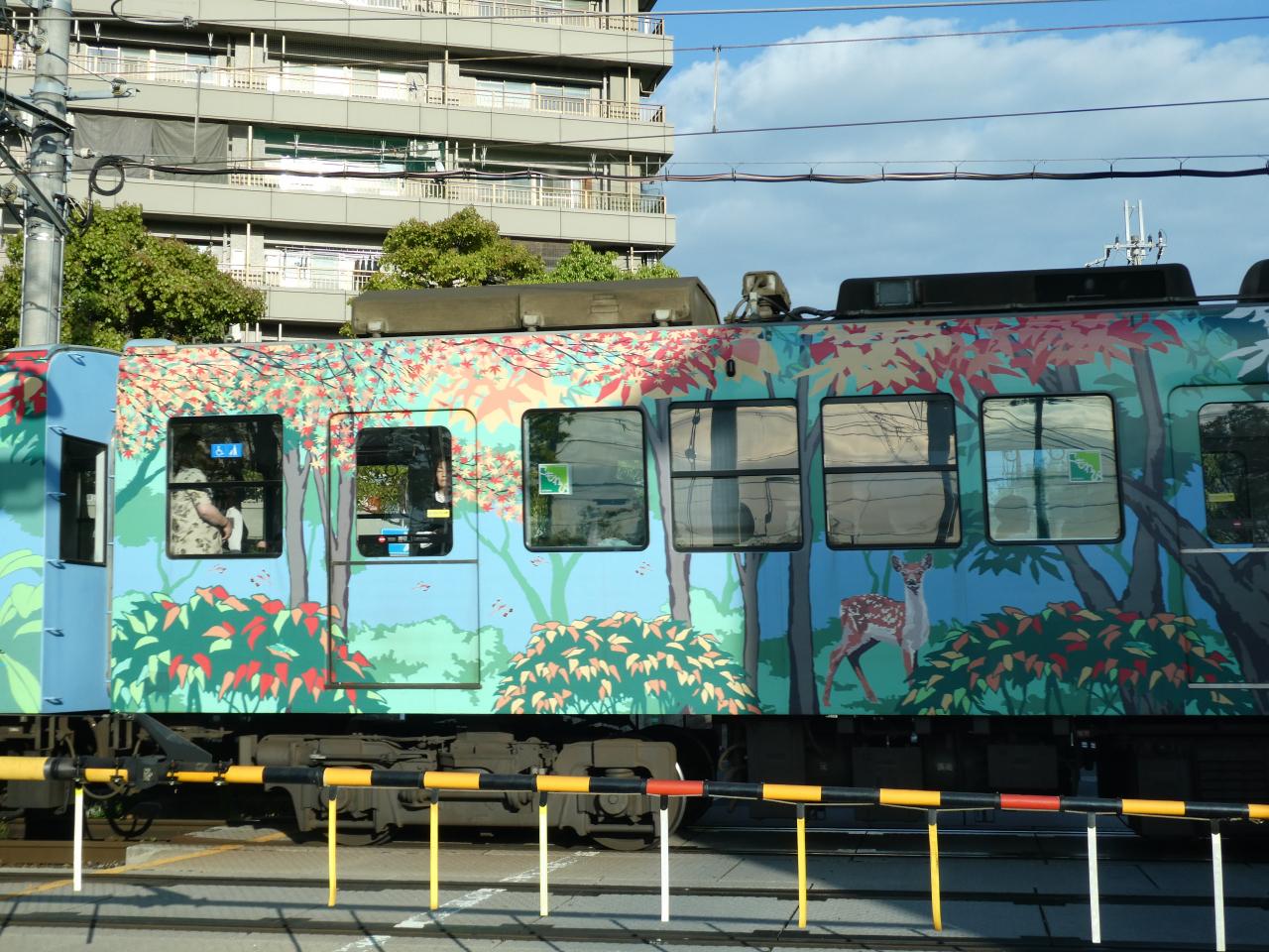 すっごいカラフルな車両が走っていったのが見えました。嵯峨野線を走る森の京都QRトレインだったのかもしれない。