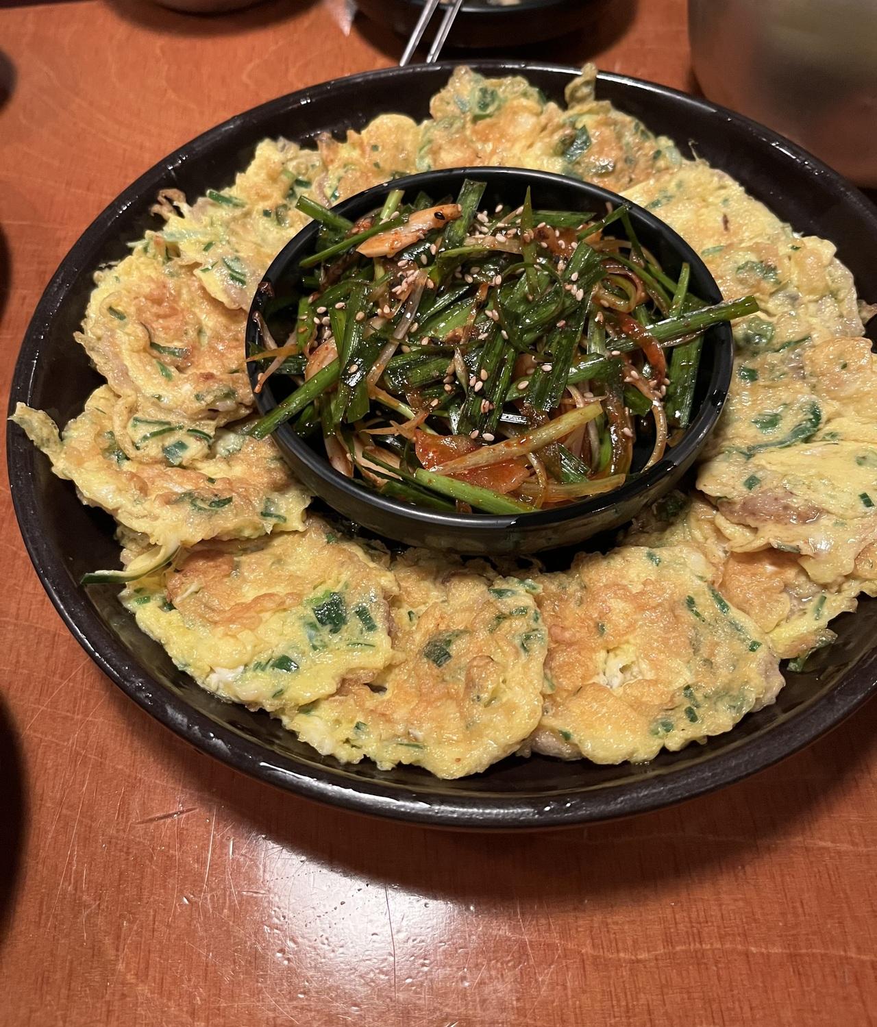 これが、美味しいのなんの。ネギにチヂミを巻いて食べると最高です! -