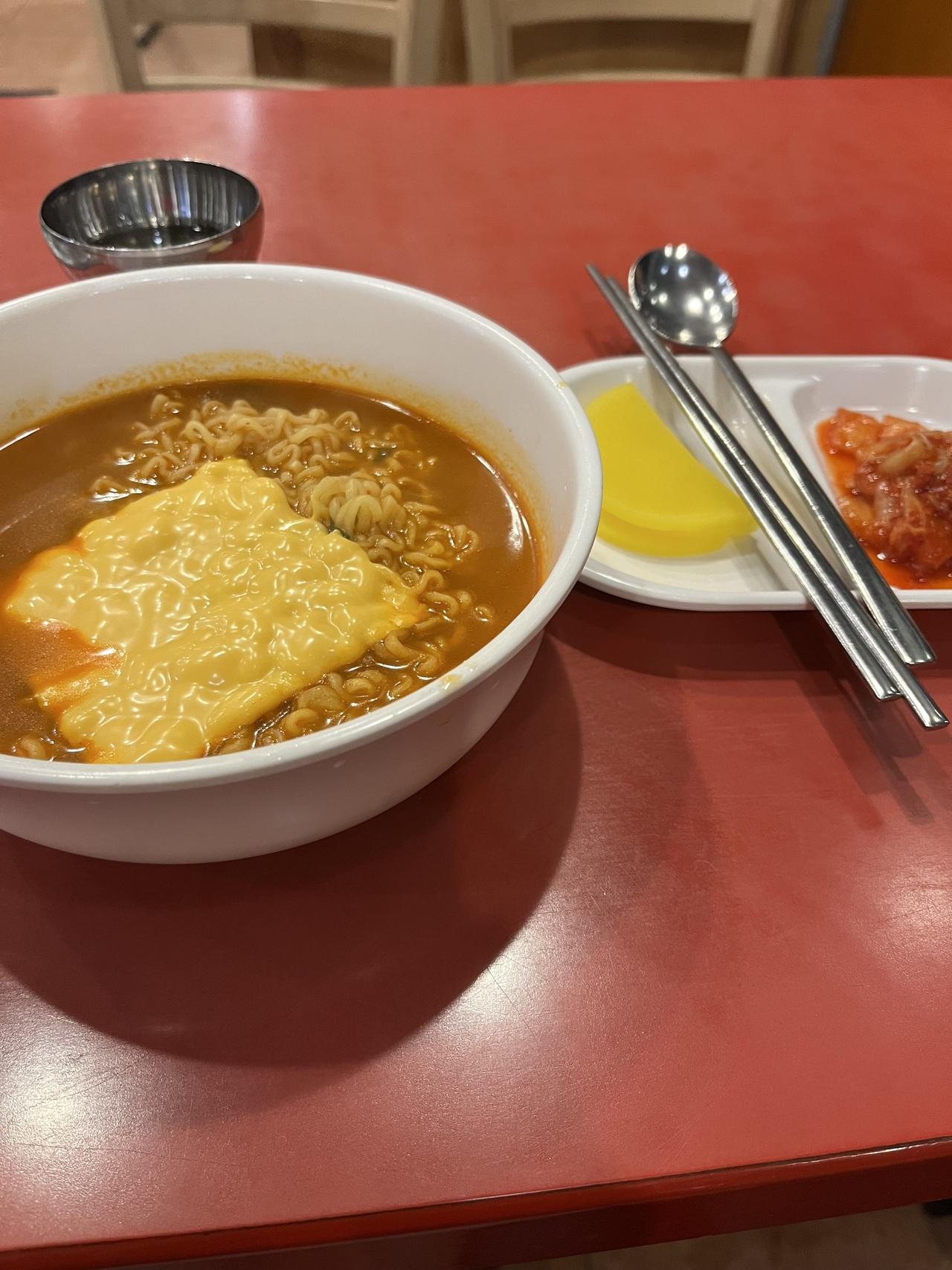 ソウルに戻ってきて、急に疲れが出たのか、ジャンクなものが食べたい~ってことで、今日泊まるホテルの近くの、キンパ天国で、チーズラーメンを。