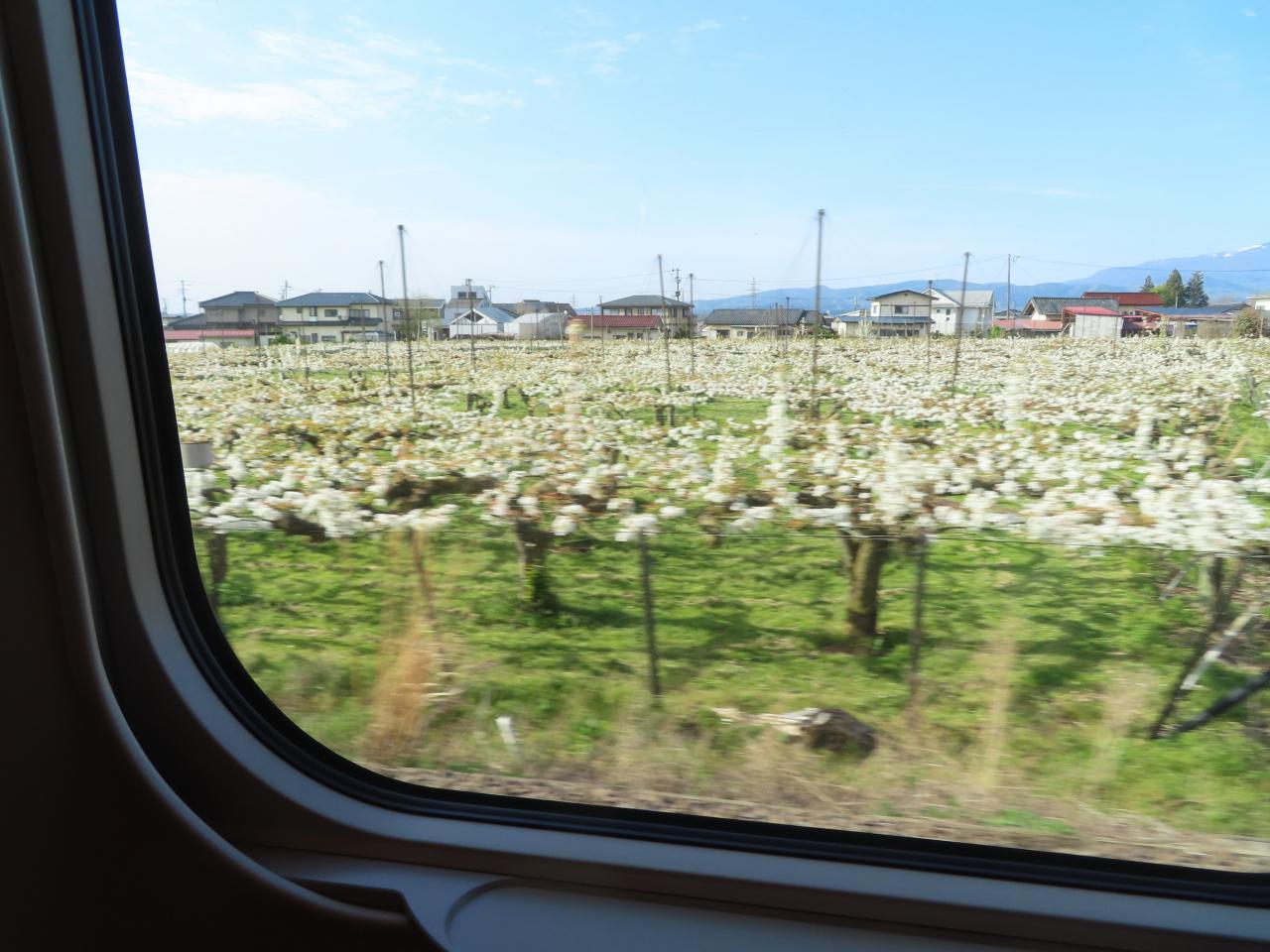 福島県に入ったら、ブドウが白い花を咲かせていて、陽春の到来を告げているかのよう。