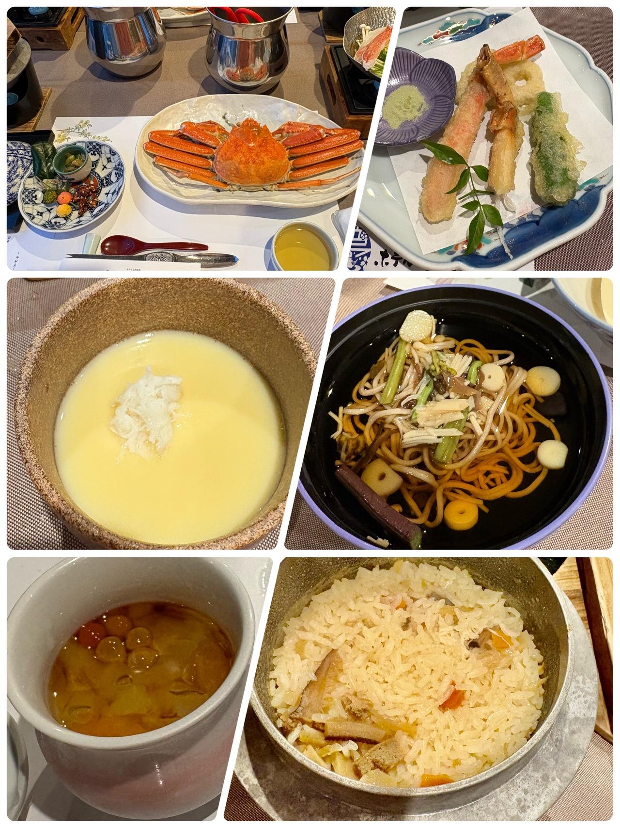 前菜・茹でカニ姿盛り・カニすき鍋・カニ天ぷら・カニ釜めし・カニ茶碗蒸し・蕎麦・漬物・デザート