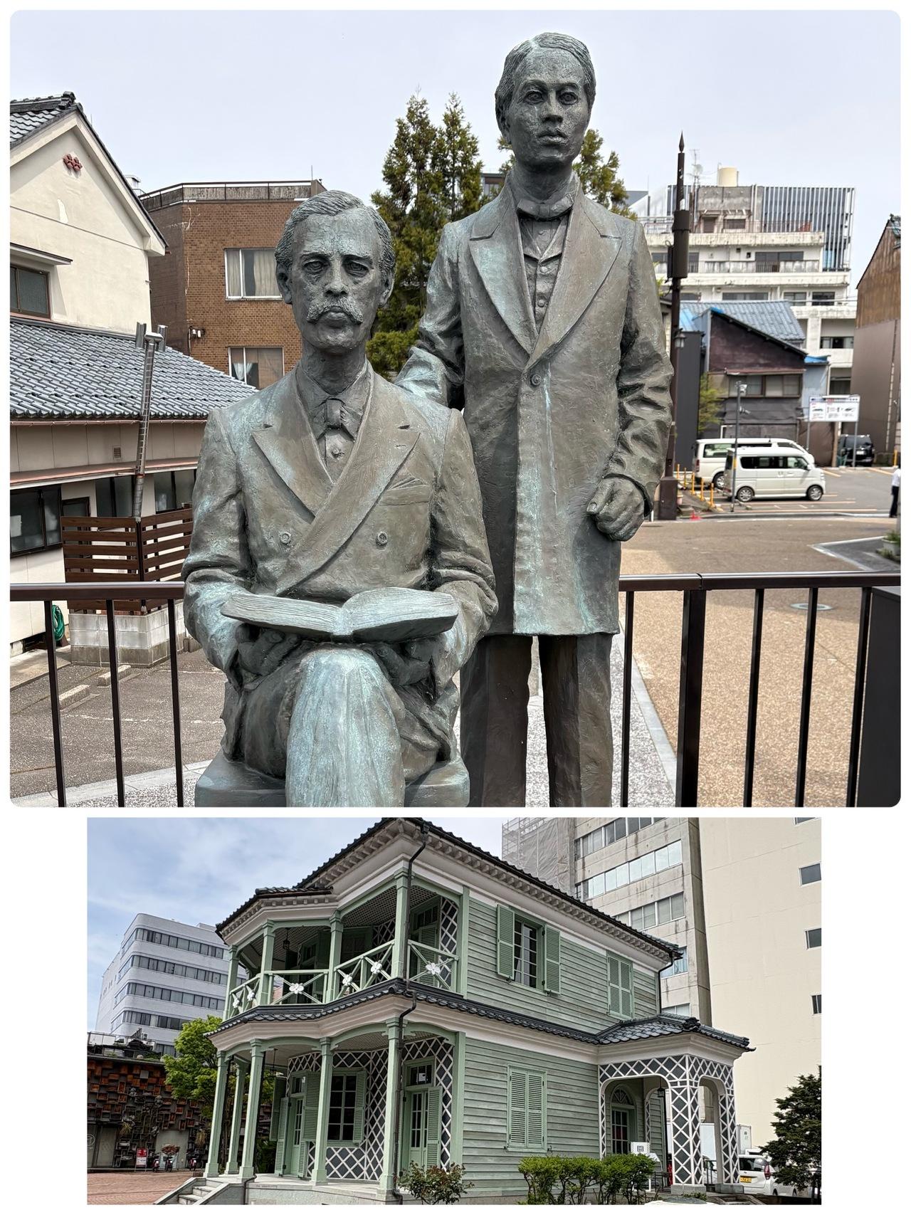 散策中に見かけたグリフィス先生と天才留学生日下部太郎さんの像