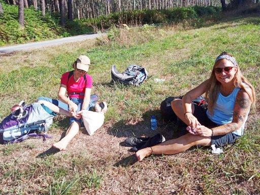 村のバルで最初の休憩のあと、キレイな草原があったのでペタンと座りこんで長目の休憩。二人は足のマメを手当てし出しました。クラウディアは水脹れのマメをハサミで切り開いて消毒する荒療治、見ていて思わずヒェーッと声が出る。こんなことを平然とやってのけるクラルディアって看護師なのかな?