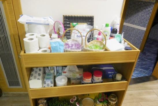 この私営アルベルゲの手厚いサービス。廊下に写真のワゴンがあって色んな小物が載っています。宿泊者はその中の必要な物を自由に頂いていいスタイルです。私は特段欲しいものは無かったけど、鏡がある所を見ると化粧に関係する物もあるようだ。消毒薬らしいのもあるので、マメの治療に使うのかも知れない。キッチンには常にお菓子がテーブルの上に置いてあり、コーヒー等も好きに飲むことができます。唯一、冷蔵庫の飲み物だけは有料だった。