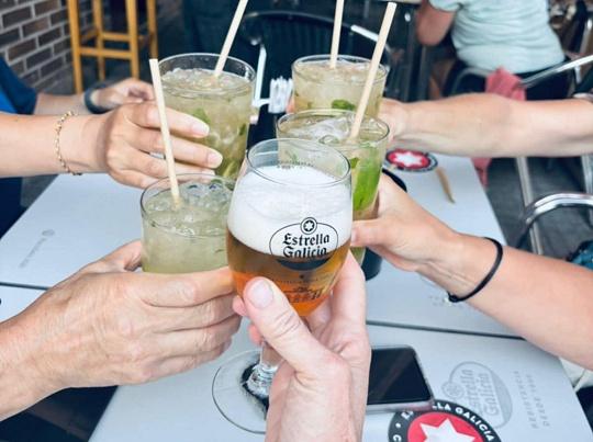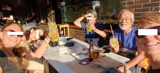 時間通りに南アフリカ女性も一緒にやって来て暫く歩いた先の道端のバルに決まった。楽しく5人で酒盛りの始まり。私は音声で翻訳したいので早速バルの兄ちゃんにWI-Fi の問い合わせをして宴会の準備。