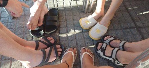 何故かみんなのサンダルまで撮った人がいます。カメラの位置から想像すると、これはモナが撮っている。みんなサンダルだけど台湾婦人だけはスリッパだった。私のは百均の300円サンダルです。南アフリカ婦人が指をさしているのでサンダルの写真を撮ったようだが、何を言っているのか分らない。
