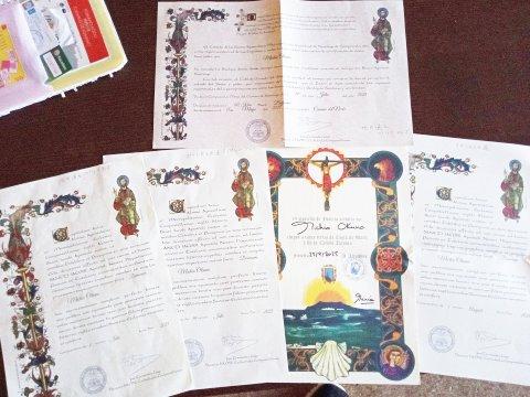 左から、北の道(+プリミティボ)、ポルトガルの道、フィステラの道にイギリス人の道。上にあるのは巡礼事務所のおばちゃんが勘違いして勝手に発行された北の道の距離証明証です。
