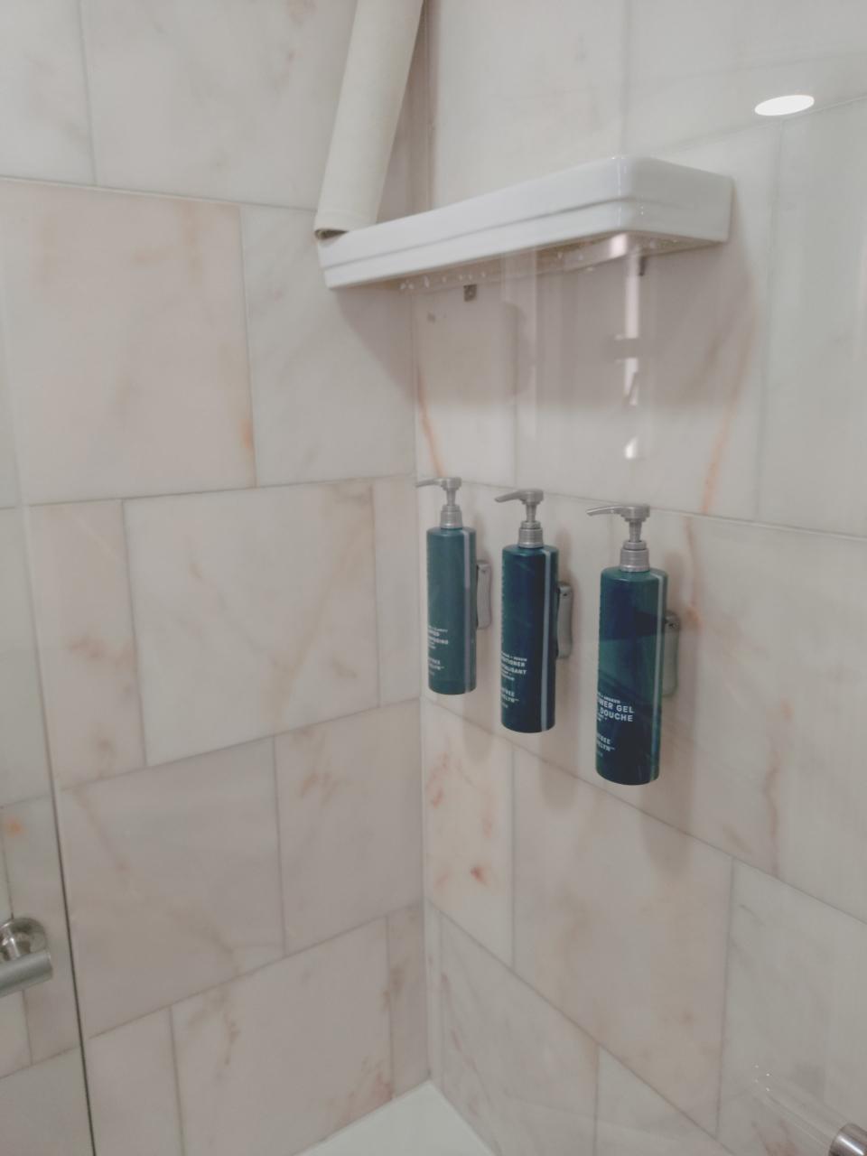 バスルーム。Crabtree & Evelynのバスジェル、シャンプー、コンディショナーが備え付け。取り外し不可。洗面台には、ボディローションもあった。ドライヤーもあり。