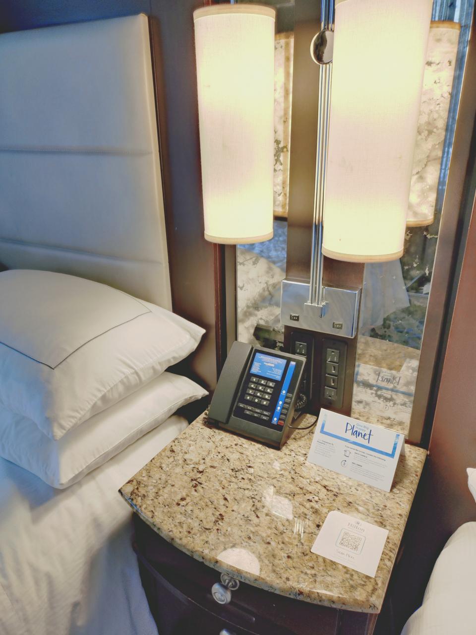 ベッド間のテーブルにはコンセントがあり、スマホの充電はしやすい。