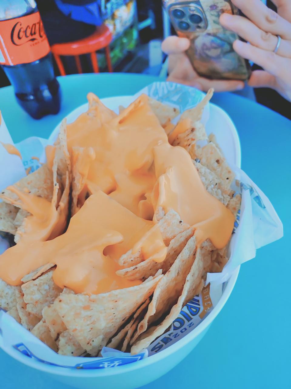 チーズナチョスヘルメット。ヘルメットにナチョス(トルティーヤ的なもの)が入り、チーズソースがかけてある。最初の1,2,3口はおいしいけど、飽きる。