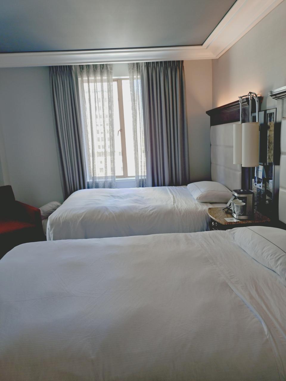 宿泊はヒルトンチェッカーズロサンゼルス。JTBのサイトでのホテル選択時に、2bedsが選べるダウンタウンのホテルがここしかなかったので。ドジャースタジアムへの拠点になっているDouble Treeはツイン指定がなかった。