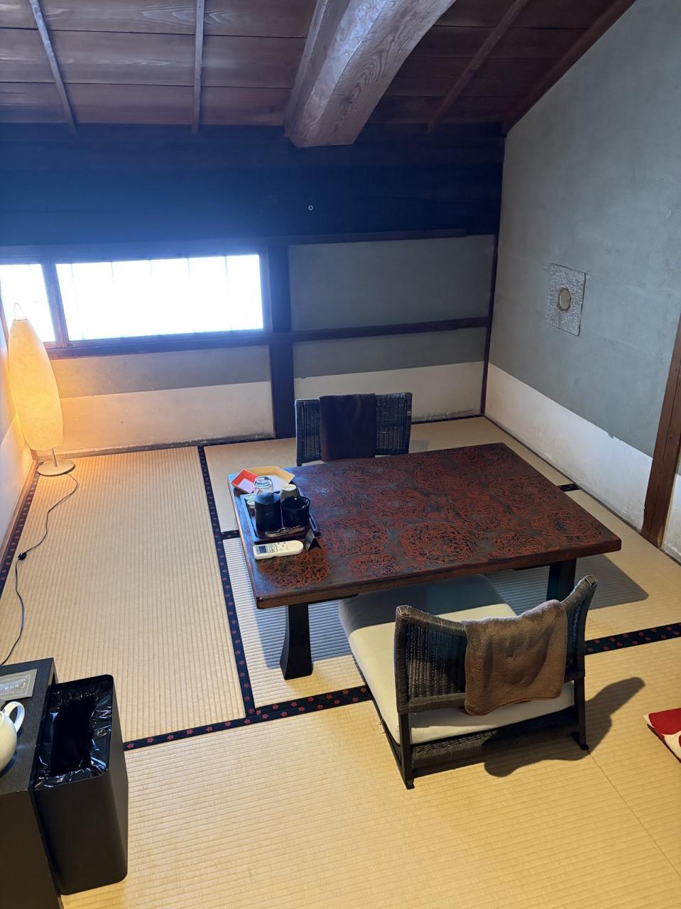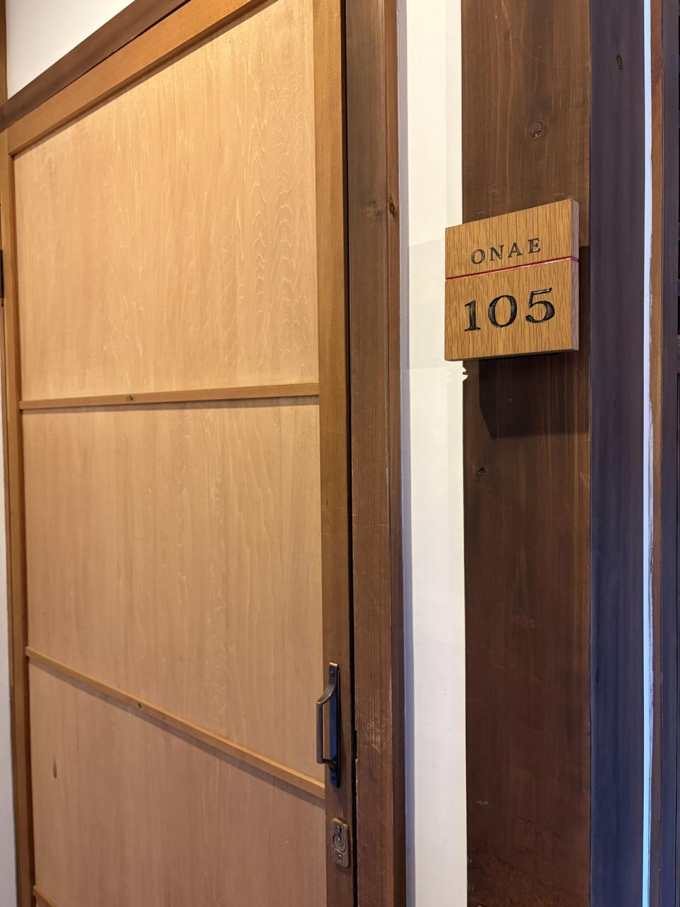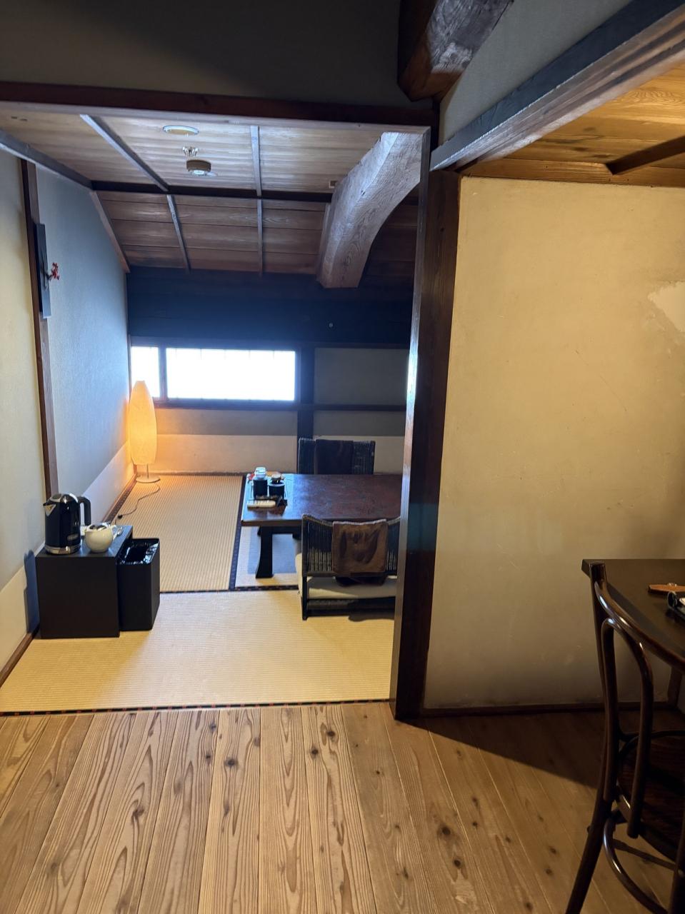 おへやは、OMONEの105 フロントや、レストランのある棟です。口コミでは音が気になるとあったけど、夕食時に日本酒を呑む予定なので移動がない方が良いのでむしろラッキー。確かにチェックインの時耳栓もあったし、21時頃迄は音楽や話声が聞こえていたけど、私は気にならなかったな。朝夕少し寒かったので毛布もありがたかったし、可愛い浴衣もあった。