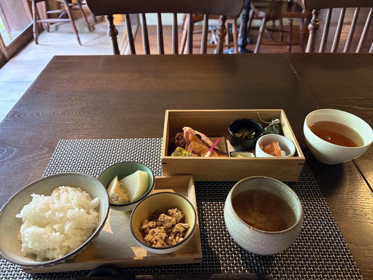 丹波篠山の名物を目一杯使った和食。牡丹鍋を模した味噌汁も(黒豆味噌)も美味しかった。