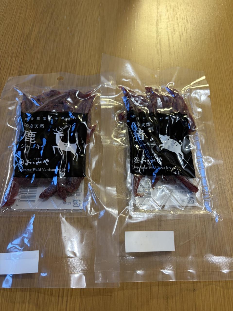 おゝみやで買った、猪ジャーキーと鹿ジャーキー。