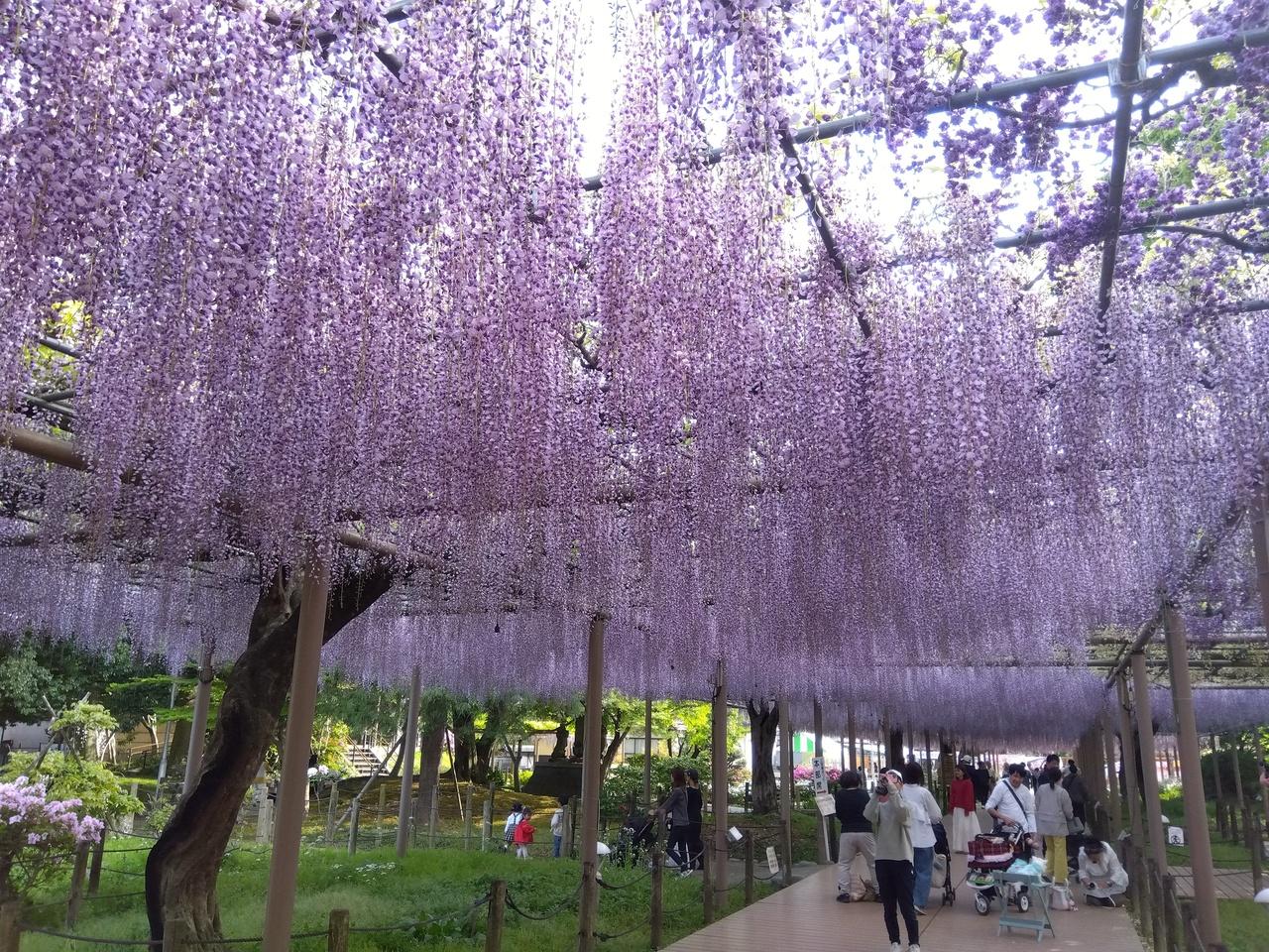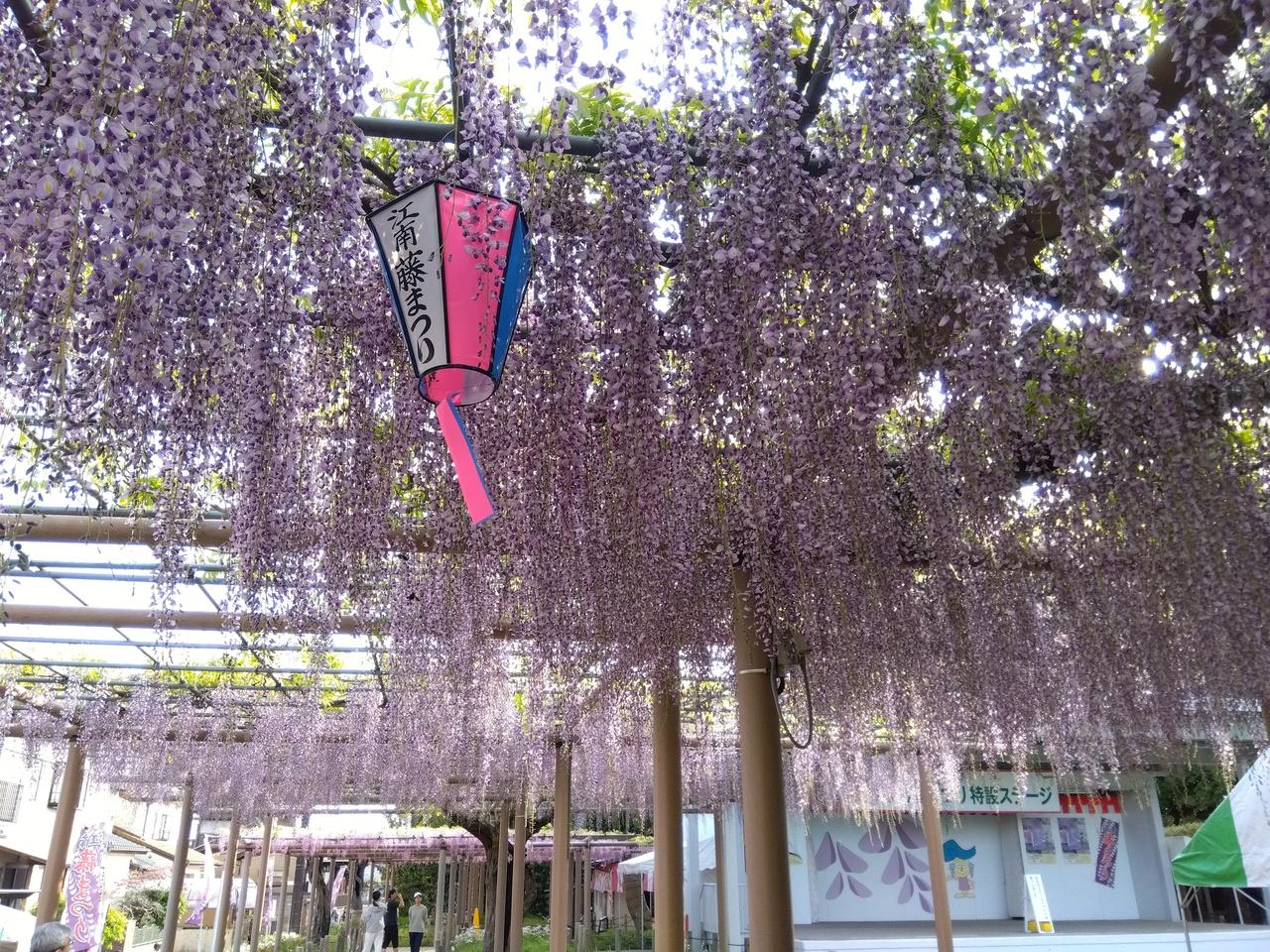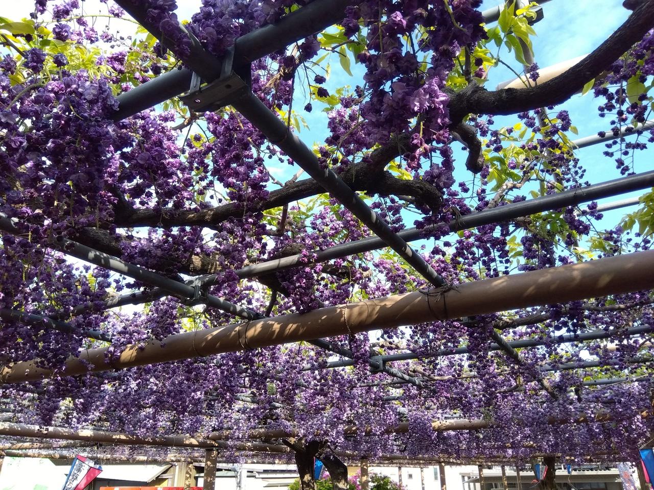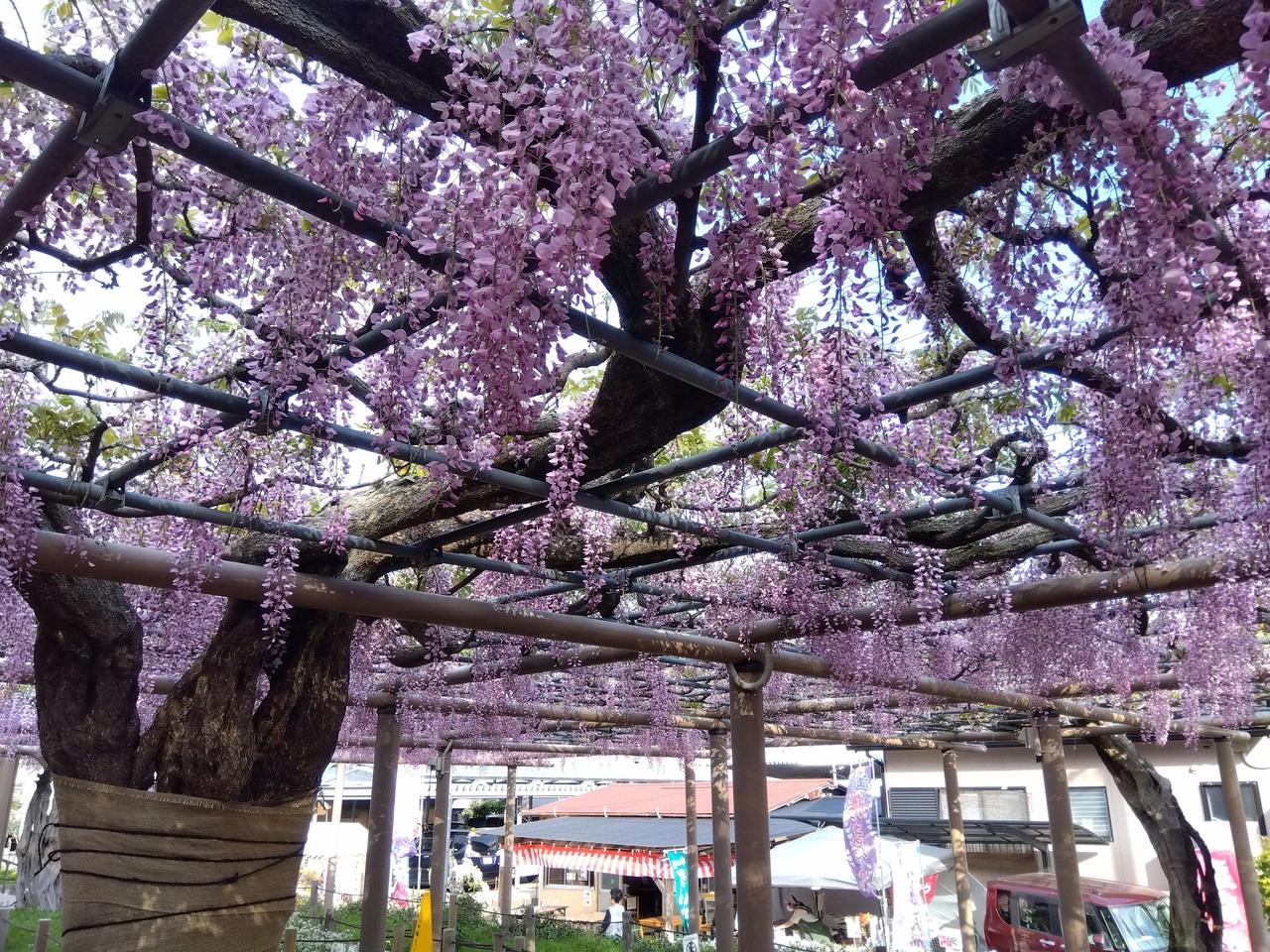 曼荼羅寺公園の藤まつりで藤の花が満開になってきました。藤棚の面積はかなり広いです。今日は平日であまり開いていなかったが屋台がたくさん出ています。